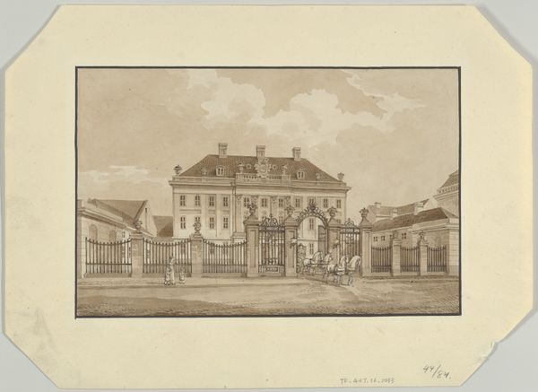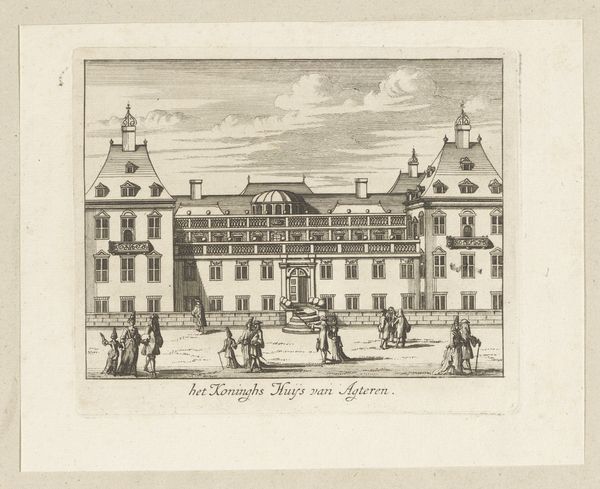 This is Leonard Schenk’s engraving "Gezicht op het Weeshuis te Alkmaar". The eye is immediately drawn to the orphanage with its symmetrical facade, a formal composition that speaks to the order and structure of institutional life. Notice the artist’s technique: precise lines and calculated shading render the architectural detail, while the softened clouds lend a sense of depth. The orphanage’s facade dominates, yet a boat in the foreground offers a contrasting human element. Schenk employs a formal arrangement not just to depict a building, but also to communicate ideas about society, order, and perhaps even the relationship between the individual and the institution. This controlled rendering invites us to consider the visual language of power and social structures inherent in the image. The linear precision and formal balance prompts us to question how institutions present themselves and are perceived by the broader public.