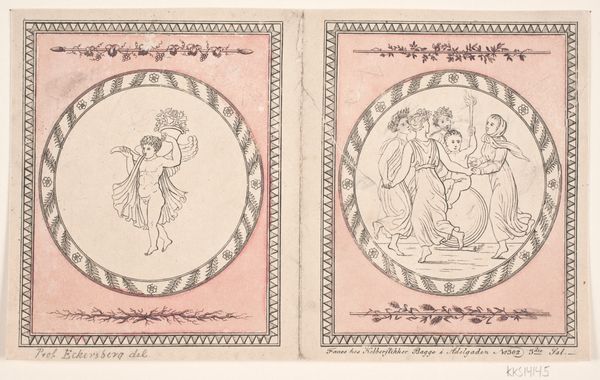 Editor: Here we have Oluf Bagge’s “Omslag til Nytårsvers”, created between 1806 and 1810. It's a print, using engraving and perhaps some watercolor. The figures seem to be in motion. What’s striking is that the bottom figure is upside down, compared to the dancing one above! What's your take on this piece? Curator: Consider the materials. Printmaking, particularly engraving, was a skilled labor. It allowed for wider dissemination of imagery. Look closely. The delicate lines speak to a time of meticulous craft. This wasn’t simply art for art's sake. The "Nytårsvers" in the title suggests it was a New Year’s greeting. We must examine how these greetings were produced, distributed, and consumed. Think about the engraver’s labor versus the recipient’s leisure. Does this dynamic change your perception? Editor: That makes sense. So the process of creating something that could be distributed widely adds another layer to the work itself. It challenges this traditional idea of the unique art object. Curator: Exactly! And what about the imagery? A festive gathering contrasted with a figure, quite literally, overturned? What comment could Bagge be making about labor and life via such contrasting depictions? Is he hinting at societal imbalances even in times of celebration? Consider too the consumption practices involved. How might such images of apparent celebration normalize or obfuscate the difficult socio-economic realities present in 19th Century Europe? Editor: Hmm, interesting. Perhaps he's saying something about the flip side of festivity? What at first seemed like a straightforward celebration might actually hold a more complex commentary on society and class. I hadn’t considered how the material and means of production influenced my reading of the image. Curator: Precisely. Material analysis can be more than just appreciating aesthetics. It can illuminate power structures inherent in artistic production. Remember to ask: who made it, how was it made, and for whom was it intended? Editor: I'll definitely keep that in mind. Thanks for pointing out all of that; I am definitely looking at this piece, and others, through new eyes now!