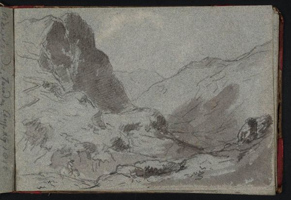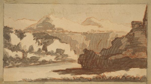 Curator: This delicate graphite drawing, held in the Tate Collections, is by Sir George Howland Beaumont. Though untitled and undated, Beaumont lived from 1753 to 1827. Editor: It has a dreamlike quality. The mountains and water seem to emerge from the page. Curator: Observe how the artist uses varied pressure to delineate form. The economical use of graphite on this support hints at a rapid, perhaps plein air, study. What stories could the paper grain tell us about its manufacture and distribution? Editor: It is fascinating to consider that this landscape, so placid, might have been shaped by violent geologic shifts, perhaps mirroring the social and political upheavals of Beaumont’s time. Curator: The binding also offers some insight into the artist's world. Editor: I see it slightly differently now. Thank you. Curator: Indeed. Thank you.