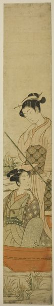 Curator: Look at how Harunobu employs line in this print, The Heron Maiden. Its delicacy really sets a pensive mood, doesn't it? Editor: Indeed. I feel a strange stillness radiating from this ukiyo-e print. It is such a simple composition, and yet it invites introspection. Curator: Absolutely. Suzuki Harunobu made it around 1766 or 1767, a key period when multicolored woodblock printing, known as nishiki-e, became increasingly popular in Japan. Harunobu himself was instrumental in its development. Editor: Tell me more about nishiki-e and its socio-cultural importance? Curator: Certainly. Nishiki-e, meaning "brocade pictures", emerged as a response to growing demand for richer, more vibrant imagery amongst the rising merchant class in Edo. It signified not only artistic advancement but also shifting social dynamics, enabling broader audiences to access colorful art that was once reserved for the elite. These prints provided glimpses into contemporary life, theatre, and fashion, celebrating the vibrant culture of the time. Editor: I see how Harunobu captures ephemeral beauty through meticulous carving and printing; look at how each line and color interact. How would you read the composition of this artwork using its visual and technical vocabulary? Curator: Harunobu uses a limited palette of muted tones here, creating a subtle harmony. Note the elegant curvature of lines depicting the maiden's robes and the stylized umbrella above, which serve to frame the face while guiding the eye smoothly downward. I must add the expert use of negative space further accentuates the delicate quality of this woodblock print. The overall effect captures something profound about quiet beauty in Japanese culture at the time. Editor: It seems these beautiful figures and refined sensibilities quickly became symbols of social sophistication as they were replicated, collected, and circulated widely within the middle classes. Curator: That's precisely it. Now part of the collection here at the Art Institute of Chicago, The Heron Maiden offers insights into the complex interplay of aesthetics and culture that defined 18th-century Japan. Editor: The interplay between line and form is beautifully understated. Curator: It really draws the viewer in. This is just a small glimpse, but it is an enticing glimpse, into the world that Harunobu was showing to the art consumers of his time.