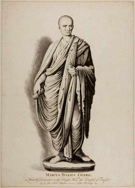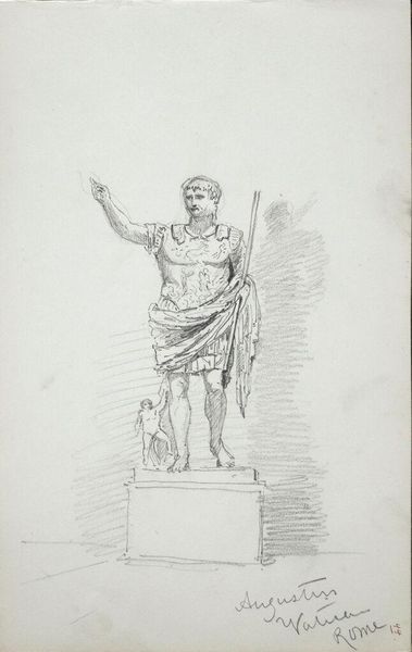 Curator: Well, this pencil drawing by Nicholas Roerich is entitled "Sophocles" and was completed in 1893. It depicts the famed Greek playwright as a statue. Editor: You know, my first thought is: imposing! Even as a drawing, it has this gravitas. There is so much detail, especially in the drapery. You can practically feel the weight of those folds. Curator: The classical drapery is deliberate; the toga is indicative of civic identity, and perhaps more personally here, a mantle of tragic vision. Note the subtle way Roerich captures the texture of the stone. It lends the drawing a three-dimensional quality. Editor: It also strikes me as incredibly...static. Of course, it's a statue, but I mean more than that. Sophocles, the actual, living, breathing human, must have been this tempest of thoughts and feelings to be able to produce those plays! Here he is frozen— literally calcified. I find it oddly unsettling. Curator: You're absolutely right, but I also believe it makes a point about enduring legacy. Sophocles’ works transcended his mortal coil; the image has become something larger, representing drama, even civilization itself. I read this drawing as an essay on time. Editor: I get that intellectually, but still, doesn’t it feel like he’s lost something too? Maybe that's what resonates, that trade-off between immediacy and permanence, presence and absence, that plagues every artist! Curator: Roerich certainly tapped into something profound here, that continuous cycle of presence and enduring symbol. Thank you, I will not see it the same way again. Editor: Same! It makes me want to grab my pencil. I need to process that in creative expression now, or it's going to keep haunting me.