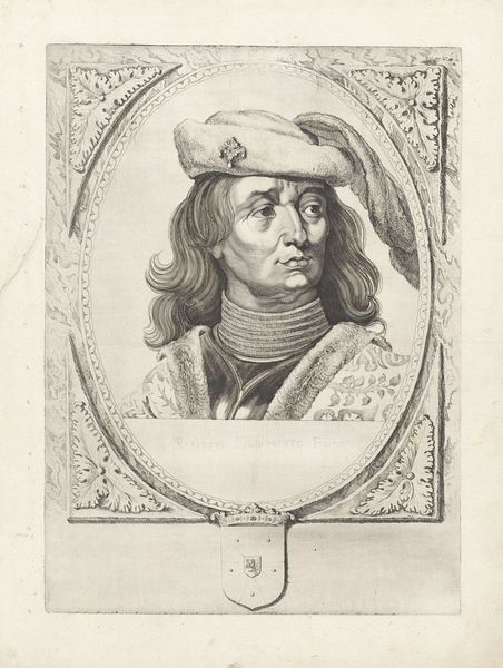 Curator: Before us, we have Cornelis Visscher's 1650 engraving, “Portret van Dirk VI, graaf van Holland,” currently residing at the Rijksmuseum. Editor: The etching creates such an odd, ethereal atmosphere. The way the subject is framed contributes to a striking feeling of disconnection and ambiguity. Curator: Absolutely. Visscher's strength lies in the structural arrangement; the oval frame adorned with floral motifs perfectly contains and contrasts with Dirk VI. Notice the stark heraldic shield below, which acts as a visual anchor, stabilizing the composition. Editor: And the detail in the material rendering is rather fascinating. Consider the labor involved in producing this precise matrix. It is made possible by the network of craftsmen creating the paper, inks and pressing equipment for the printer, an unseen army, rendering it reproducible and democratizing noble representation. Curator: Indeed. And what’s fascinating is the way Visscher uses the etching technique to define the portrait's emotional texture. There's a deliberate choice of line quality, with short, hesitant strokes building up shadow and depth, giving the piece a nervous tension. Editor: Look, you can almost feel the density of the paper and smell the oiliness of the ink, considering all the careful steps in the work. Its physicality offers us a glimpse into 17th-century artisanal practices. Curator: By isolating him in this ornate oval, Visscher encourages us to analyze Dirk VI. Stripped bare of his context, he's transformed into a symbol, ready for structural decoding. Editor: But the material context also transforms the reception. As it moved through early modern urban centers, its meaning was further negotiated by the shopkeepers who sold it, the collectors who archived it, and those who encountered it in daily life. Curator: Well, I suppose the convergence of form and social context presents multiple angles of exploration when interpreting a portrait such as this one. Editor: Exactly, and this type of print helps us investigate art beyond a privileged setting and look instead at its use by, and presence in, early commercial environments.