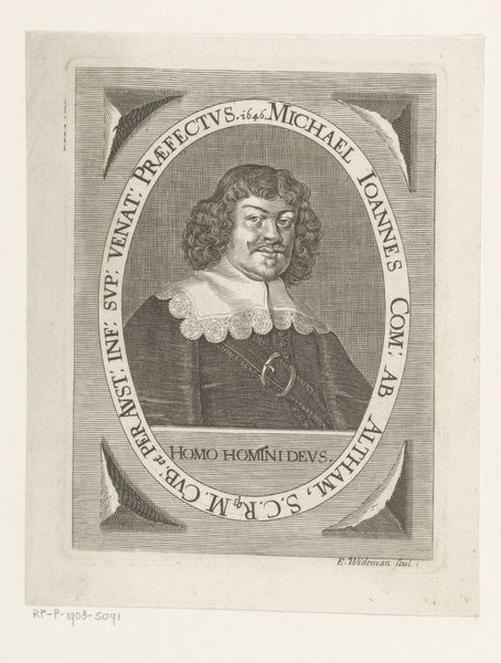 Curator: Here we have Matthäus Merian the Elder's 1652 engraving, a portrait of Sebastian Otto. Editor: My first impression is one of intense formality. The stark monochrome, the tight framing – it conveys a sense of serious purpose. Curator: Indeed. The image is a product of its time, part of the Baroque era’s vogue for portraiture, used increasingly to project status and civic power. Etchings and engravings like these became a way to disseminate images of prominent individuals across society. Editor: Look at the way his gaze engages us directly, commanding attention. The oval frame around his likeness is not merely decorative. It functions almost like a signet ring, imprinting him into our memory. Curator: Good point. We should also note that the inscription at the bottom of the engraving lists Otto’s titles: a Doctor of Law, Councilor, and legate at peace conferences. Editor: These emblems underscore that the engraving transcends simple physical likeness. They signal the symbolic weight Sebastian Otto carried within the political theater of the day. Curator: Exactly. The choice to depict Otto through the precise and reproducible medium of engraving underscores the subject’s role as a public figure. The multiple copies of this artwork, accessible to society, reinforce the civic structures it promotes. Editor: What strikes me is how those delicate curls of hair around his face soften the image. It adds humanity to an otherwise stern representation. Curator: That detail invites us to consider the balance between the individual and their social role in Baroque portraiture. It invites curiosity beyond the titles into the life of a person. Editor: Looking at it that way transforms the piece from just a historical record into an intriguing exploration of identity and image construction. Curator: Precisely. The social function and historical insight makes one admire Merian’s piece even more.