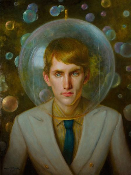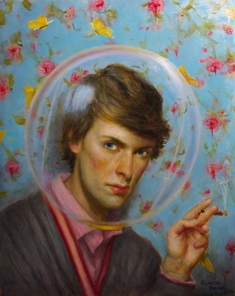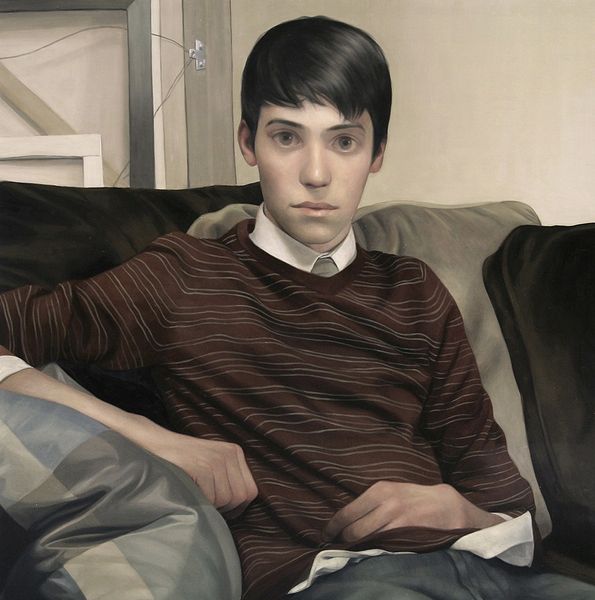 Curator: Before us is Lu Cong's "Corban #2," an oil on canvas portrait completed in 2011. It depicts a young man in a patterned shirt, set against an ambiguous backdrop. Editor: The first thing that strikes me is the almost photographic realism, and yet, there's something subtly unsettling about it. The color palette feels muted, almost drained, creating this slightly melancholic mood. Curator: The photorealistic style you've noticed raises an important point. How do these contemporary portrait practices intersect with the history of portraiture itself? Think about the labor involved. Oil paint, canvas... traditions tied to the academies. Yet, there's a detachment here that perhaps reflects the influence of digital image-making on painting today. Editor: Exactly. We’re used to highly filtered images and here we have this interesting commentary on how that now influences our idea of reality and what a ‘true’ representation even means. Are we meant to admire technical skill, or dissect the way it toys with ideas about truth and beauty circulating in art history and broader image culture? How does this artwork want to be understood by viewers? Curator: Well, the painting exists, firstly, within the social space of a gallery. It's positioned there, consumed by the viewer, as art. Cong uses that context to make, in some way, critical reference to a kind of 'factory' style of modern visual production and its effect on historical portraiture. He adopts realism but avoids overt emotion. Editor: Yes, look at the fabric, for instance. The treatment is nearly hyperreal, it brings focus on materiality and repetitive process through a simple piece of clothing. It asks a question, maybe: what are the politics inherent in even the most ‘innocent’ and mundane materials that we might see depicted or worn daily? Curator: It makes you wonder, doesn’t it? So, while "Corban #2" appears deceptively straightforward at first glance, a deep engagement with its making, its influences, and its social placement uncovers interesting lines of inquiry. Editor: I agree. We end up questioning what the role of a painting such as this is. Is it purely a representational object or does it function as a lens through which we can examine wider practices of cultural and commodity production? It certainly gave us much to discuss.