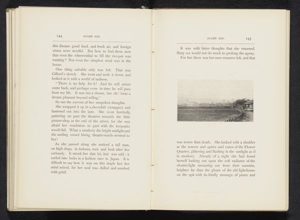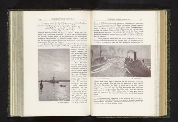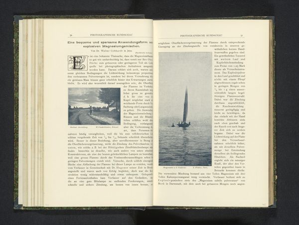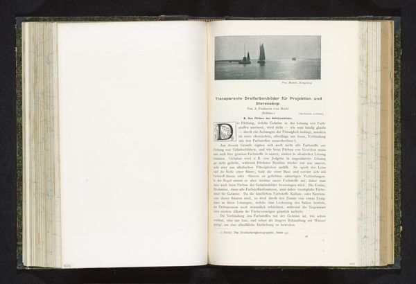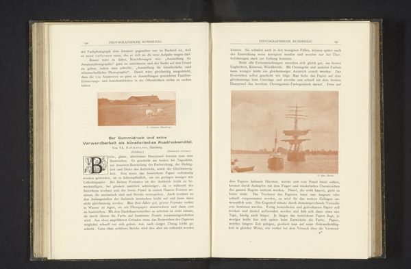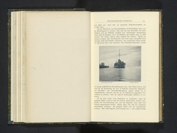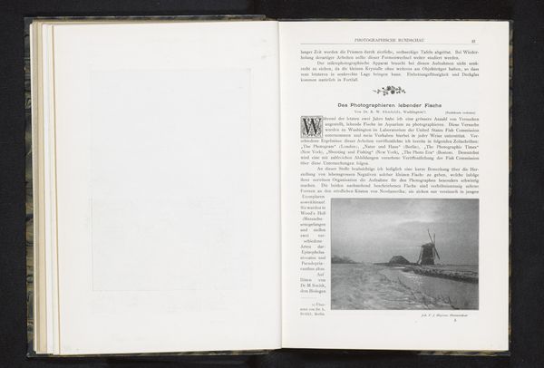 Curator: We are looking at a black and white print called "Gezicht op een weide met koeien en een molen," which translates to "View of a meadow with cows and a windmill". It's attributed to W. Sasse and dates to before 1899. It's presented as part of a bound volume of photographic prints. Editor: My first thought is "bucolic idyll". There's a feeling of serene simplicity, the way the horizon line cuts through the middle... a compositional flatness, yet something quite pleasing. Curator: Observe the strong horizontal bands created by the landscape. See how the cows are meticulously placed, and how their forms act as dark, repetitive shapes against the field's lighter tones. This formal arrangement provides an interesting rhythm. What does the windmill mean here? Editor: Well, windmills frequently signify prosperity and the Dutch Golden Age. This landscape is steeped in established iconography. But in this muted, nostalgic presentation, perhaps it hints at a memory of prosperity rather than the full bloom. There’s a slightly melancholic air about it. Curator: True, the restricted tonal palette, achieved through the gelatin-silver print, lends a retrospective air. There's an almost mathematical precision in the depiction, too. Consider how the mill balances the weight of the herd on the opposing side. Do you get any symbolic feeling from that symmetry? Editor: It creates an image of stability and enduring order. The artist arranges both the literal components, such as the cows and the mill, but by carefully weighting them gives the print the feeling that all’s right with the world. At least, all was right at that moment, that day, on that meadow. A snapshot of peace that holds a poignant weight looking back on it. Curator: I would say it offers insight into formal techniques employed in service to an overarching, symmetrical pictorial project. Editor: And I see the shadow of that enduring composition continuing to resonate in the visual vocabulary of the future.