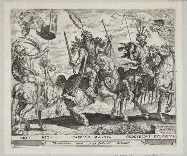 Curator: Ah, yes. Here we have Anton Joseph von Prenner’s engraving from 1728, “Aeneas fleeing Troy.” A story of epic proportions, literally rendered here in fine lines and cross-hatching. Editor: Immediately, I'm struck by this frantic energy, even in the stillness of the print. It's all movement and urgency—everyone’s desperately trying to escape something horrible. The composition emphasizes this with the figures clustered on the left, contrasted by that vast open landscape in the distance. Curator: Indeed, Prenner captures a pivotal scene from Virgil’s Aeneid, Aeneas carrying his father, Anchises, from the burning city, while leading his family to safety. It's steeped in history-painting conventions and, of course, it functions as an allegory of duty, piety, and the burden of legacy. Editor: You can feel the weight, can't you? Not just the literal weight of Anchises on Aeneas's back, but the burden of history, family, and destiny pressing down on him. Look at the musculature in his legs, his straining neck…it's all exquisitely rendered in such detail. I’m moved. Curator: And consider the Baroque aesthetic – that dynamic composition, the dramatic lighting implied through the varying depths of the engraving, even the heightened emotional expressions – it all underscores the magnitude of the event and the inner turmoil of its characters. Note the details: even the tiny ship in the distance awaiting their escape becomes a beacon of hope. Editor: Absolutely. The way he uses line— the density near the collapsing building, lightening towards the implied sea… Prenner brilliantly uses formal elements to narrate this exodus. I admire how this image, composed in blacks and whites, brings this rich and storied narrative to life with palpable feelings and human stakes. Curator: He manages to condense an entire epic poem into a single, evocative scene. It's quite remarkable to consider all those layers—mythological, historical, emotional—woven together. Editor: Looking closer has illuminated all that suffering and resilience so deftly held in place. The lines and the figures—once just elements—now pulsate. Thanks for showing me this gem!