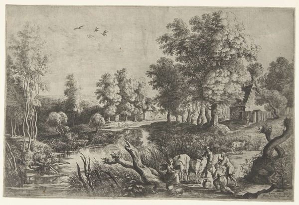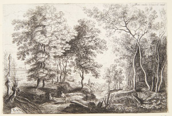 Curator: What catches my eye is how deeply etched this landscape feels, like a memory surfacing. I see tired laborers pushing their cart. How about you? Editor: I love how the dark, rich etching renders such a tranquil scene. It almost feels cinematic—the deep shadows and contrasting light giving it this amazing visual texture. It’s melancholic and earthy. Curator: Absolutely. We're looking at "Landscape with Men Pushing an Unloaded Cart," an etching and print by Lucas van Uden, likely created sometime between 1605 and 1673. Van Uden, a master of the Baroque style, encapsulates something fascinating here. Editor: It’s funny because initially I didn’t place it within a specific style but more of an impulse. I saw struggle and perseverance—it made me think of my own hauling burdens sometimes—so the weight definitely communicates! But I see now it’s very much echoing themes from that period. Curator: Well, the Northern Renaissance lingers in the incredible detail he achieves, while the Baroque influence can be observed in the drama of the composition, the light and shadow interplay, the theatrical rendering of nature itself as if conveying profound life lessons. Notice the weight given to daily tasks; that itself holds significance. The wagon-pushers symbolize human endurance amid the vicissitudes of the world. The artist subtly communicates universal challenges. Editor: Yes, definitely. Now when I consider that it does resonate how we perceive nature in a theatrical and grand manner and relate it to humanity's experiences. Now, what about the hidden cottages in the hills, as faint as dreams. Do they hold symbolic weight, too? Curator: Indeed. Cottages represent domesticity, safety but, rendered so faintly here, possibly fragility. This echoes the transient nature of life contrasted with an eternal, more permanent setting within the expansive, immutable landscape. They're fragile existences beneath vast nature's enduring stage. Editor: So it’s both deeply personal but symbolic. I will remember that and also I will remember the light—and shadow! Thanks! Curator: It was my pleasure! And thank you. Indeed a beautiful moment encapsulated.