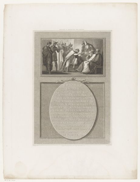 Editor: So, this engraving from 1805 by Jean Marie Delattre is called "King Richard II Suspends the Duel Between Thomas de Mowbray and Henry IV". The scene feels very staged, almost like theatre, despite depicting this dramatic moment. I'm struck by how small the figures are within the frame, lending it a sense of removed observation. What exactly is going on here? Curator: Good observation about the theatrical staging. Delattre is drawing from a historical moment, yes, but within the visual language of Romanticism, prioritizing drama and moralizing narratives. Considering this was created in the early 19th century, during a time of great social upheaval with the French Revolution, consider the impact of these historical narratives on the public's perception of leadership. How do you think an image like this, portraying a king interrupting a duel, might play into contemporary anxieties about power and order? Editor: Well, showing the king halting violence might reinforce his authority, suggesting he’s maintaining peace and preventing chaos. It makes me think about the role of the monarchy. Curator: Exactly. Engravings like this, widely disseminated, contributed to shaping public opinion, even crafting royal 'brands,' you could say. Note how the composition frames Richard II as the central, pivotal figure. Even his hand gesture suggests ultimate control. The architecture behind him further reinforces the notion of divinely sanctioned power. Do you see anything in the written description provided around Richard II that stands out? Editor: The writing details his role in fostering "civil commotion" and "general insurrections", so while he's stopping a duel here, the surrounding text condemns his character, it seems contradictory. Curator: Precisely. There is a sharp distinction between image and text. The artwork captures one frozen moment, but the broader context—revealed by the textual frame—offers a pointed critique, almost a warning against unchecked royal power and the chaos it breeds. Editor: It's like the artist wants us to look beyond the surface of this idealized image and really think critically about the history and role of leadership. I hadn’t picked up on that tension before, it's so interesting. Curator: Indeed, images were never neutral. Studying the cultural context unveils the multiple layers of meaning these artworks carried.
