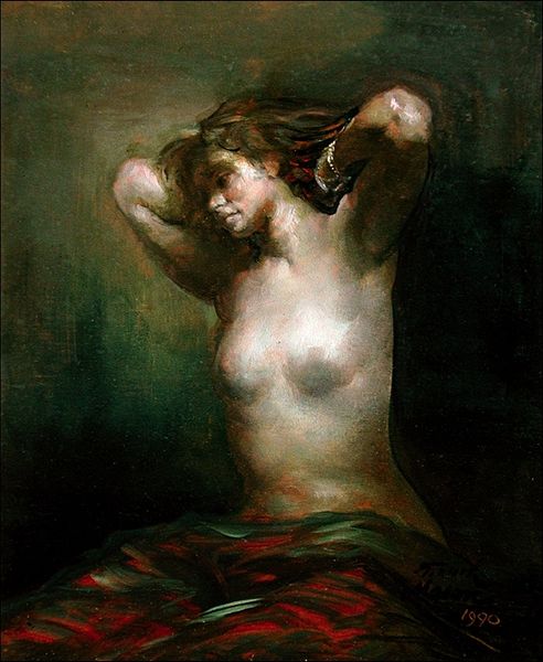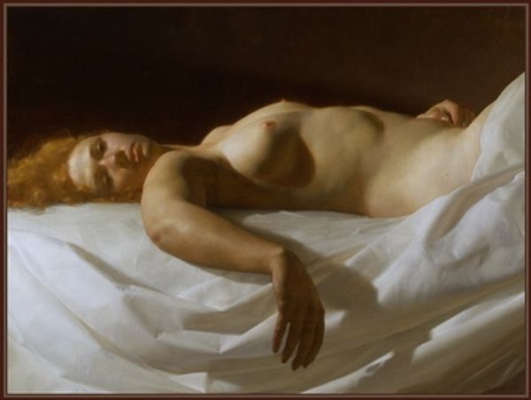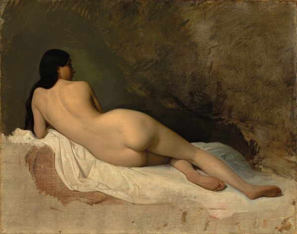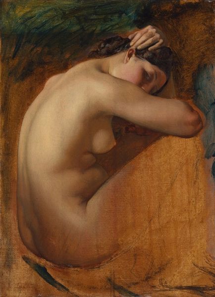 Curator: Let's turn our attention to "Model study of a sleeping girl," an oil painting created circa 1890 by Wilhelm Altheim, housed here at the Städel Museum. Editor: It’s undeniably tender. There’s a vulnerability to her slumped posture and averted gaze that feels very intimate. Curator: As a "model study," this piece offered Altheim a chance to work through the techniques common within Academic art. You see an interesting rendering of the female form, one intended for the male gaze, through careful application of oil paints and classical poses, although clearly of a model during downtime, not posing. Editor: And there is so much history in a “model study.” We should consider whose bodies get memorialized this way and in what conditions the posing happens. Curator: Exactly, the institutional and societal gaze informs its creation, circulation and even our very reception of this kind of painting. Editor: There is a complex layering of themes here, sleep being often linked with femininity and passivity and it can sometimes feel difficult not to perpetuate problematic representations in such works. How do you understand the subject’s exhaustion, which to me dominates the mood? Curator: Her body’s exhaustion, perhaps a common situation for these models, hints at those unseen pressures and social dynamics behind the canvas. The academic system also puts pressure on aspiring artists. It reveals a slice of history largely ignored, doesn’t it? Editor: Absolutely. When we discuss paintings, we should be encouraging discussion, connecting what was happening then to what’s happening now and question its legacy. Curator: Agreed. By studying such a seemingly simple scene, we not only appreciate the artistic technique and training, but also examine the political economy and its impact. Editor: Paintings like these challenge us to examine the world they emerged from and reflect critically on how they persist in our own.