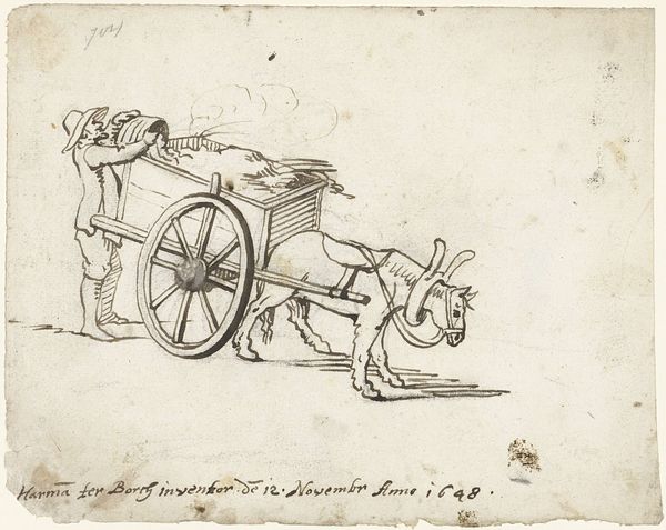 Curator: This small sketchbook page by Gabriel Jacques de Saint-Aubin at the Harvard Art Museums captures, with minimal strokes, a horse-drawn carriage. Editor: It’s so light, almost ephemeral! The quick strokes give it a sense of movement, even though it's static. Curator: Note the economy of line. Saint-Aubin reduces the carriage to its essential forms, focusing on the interplay of geometric shapes and the suggestion of volume through shading. Editor: But what about the carriage itself? It signifies status, doesn't it? The aspiration for upward mobility within 18th century French society, perhaps? Curator: Possibly, but more directly, the sketch showcases Saint-Aubin's mastery of contour drawing and his ability to convey information with incredible efficiency. The spatial relationships are deftly rendered. Editor: Perhaps. But the simplicity of the drawing evokes a dreamlike quality – a yearning for a life of elegance and ease. It's more than just lines; it's a symbol. Curator: Ultimately, this work reveals how a simple sketch can demonstrate sophisticated understanding of form and composition. Editor: It’s fascinating how a simple carriage sketch becomes a vessel for the viewer’s own aspirations and nostalgia.