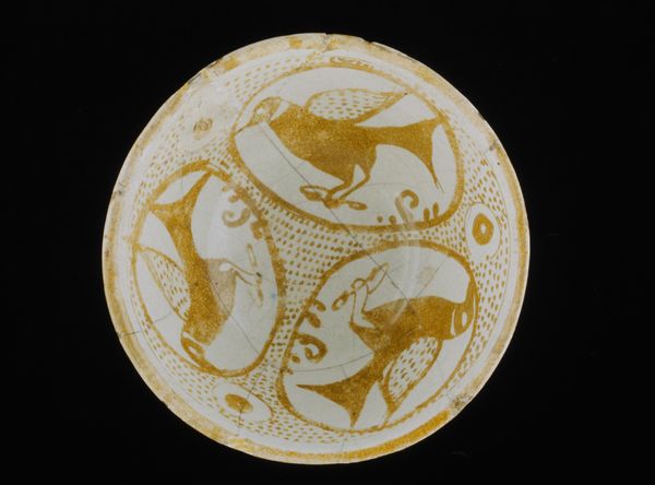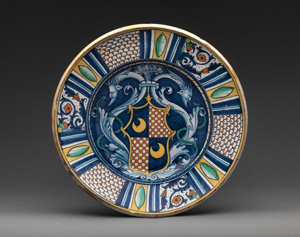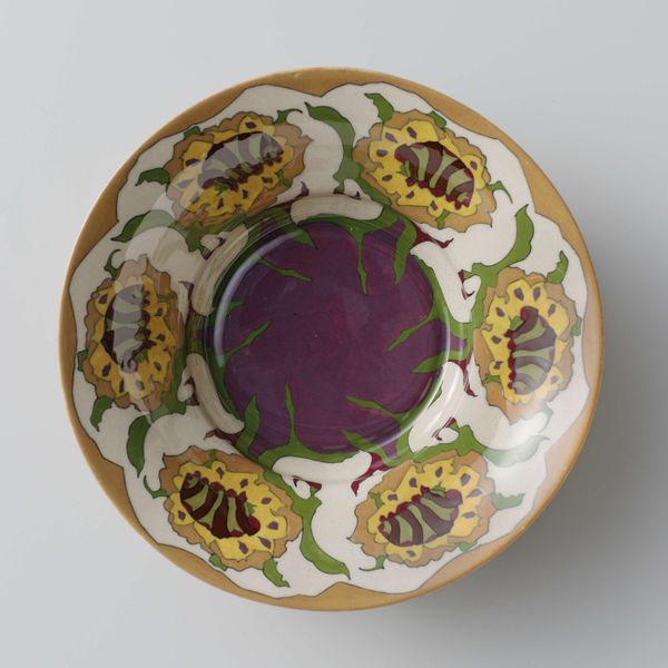 This ceramic plate with a stylized floral pattern was made by N.V. Plateelbakkerij Zuid-Holland. The pattern's bold color blocking, thick golden outlines, and graphic quality really jump out at you. It's like the artist wasn't just decorating but actively in conversation with the form. The surface has got this cool, smooth, almost glassy texture. It's hard to say for sure how they did it, but the way the gold and black sort of sit on top makes it seem like it was carefully layered on. Take a peek at the top right, at those swirling golden spirals, they're positively hypnotic. This plate feels like it's in dialogue with Art Nouveau, but also maybe a bit of Japanese design too. There's a similar embrace of pattern and an interest in organic shapes. It’s a reminder that art is this ongoing conversation, each piece building on what came before, but always in its own unique voice.