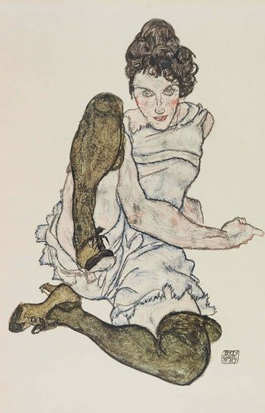 Editor: We’re looking at Egon Schiele’s 1917 coloured pencil drawing, “Portrait of the Artist’s Wife Seated, Holding Her Right Leg.” There's an unnerving tension between the figure's intimate pose and her distant, almost confrontational gaze. What catches your eye about this portrait? Curator: The composition is a masterclass in dissonance. Schiele employs harsh, angular lines to delineate the figure, fracturing her form rather than unifying it. Note how the planes of the face are almost cubist in their rendering, starkly contrasting with the sinuous curves of the stockinged leg. The limited palette of browns, blues, and reds amplifies this unease. How do you perceive the application of color in defining the subject’s affect? Editor: It feels deliberately unsettling! The blues of her jacket are almost bruising, and the red accents on her cheeks and hands hint at vulnerability or unease. It’s visually striking but also a bit… disjointed. Curator: Precisely. Schiele isn't aiming for photorealistic representation. Instead, through calculated distortion and an emphasis on line and color, he communicates a psychological state. The figure's posture, pulling her leg to her chest, creates a sense of enclosure, both physical and emotional. What effect does the negative space, surrounding her body, have? Editor: It almost feels like she’s trapped within the frame. The starkness isolates her, enhancing that sense of unease we mentioned earlier. Curator: A shrewd observation. Schiele expertly utilizes the visual language of form and color to articulate inner turmoil and isolation. It is less a portrait of his wife, and more a meditation on a particular moment. Editor: It's fascinating how much emotion he conveys just through composition and color choices, beyond just her expression. Curator: Indeed. Schiele proves the potency of formalism. Through dissecting form and emphasizing color we can uncover layers of complexity of emotive life within this portrait.