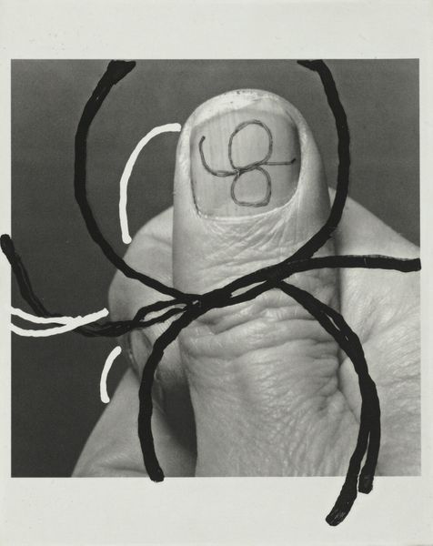 Curator: Al Taylor created this mixed-media piece, "B. (All Thumbs)" in 1997. It incorporates photography, printmaking, and sculpture elements. My immediate impression is how playfully disorienting it is. The composition teeters between recognizable and completely abstract. Editor: Disorienting is right! There's a visual tension between the sharp geometric lines, those looping gestures in the center, and what looks like a photographic element...the blurred mass beneath it all could almost be organic, maybe even representational? It challenges your expectations. Curator: Exactly! Taylor’s work often returns to these sorts of tensions. The interplay between geometric form and suggested organic shapes calls to mind cave paintings or even primitive renderings of hands, maybe suggesting an essential and basic human attempt to record ourselves, which has extended and is continuing to stretch over tens of thousands of years. Editor: And perhaps that impulse to document is frustrated here; the "all thumbs" in the title brings an air of ironic clumsiness. There's something profoundly human about failure to capture, and it’s also tied, in my mind, to issues around authorship, disability, or social roles associated with that sort of work. Curator: Yes, it raises intriguing questions about skill, intention, and even the symbolic significance of the hand itself—a recurring motif in art history that can simultaneously signify power, creation, and labor. Maybe even a deconstruction of how traditional, often white and male dominated art is “supposed to look” like a photograph with traditional drawing superimposed upon the likeness. Editor: Thinking about the context of the late 90s, during which the digital world started taking over more and more spaces, this mixed media piece may suggest a move away from relying entirely on technologically aided means for artmaking or, perhaps, it can also be understood as an early contemplation of our current technological overload that has removed many people away from a dependence on physical actions or dexterity. Curator: So much food for thought, seeing a work which is, on the one hand, very simple and very reduced, and seeing that simple thing lead to some quite sophisticated questions. Editor: Agreed. And now I am left to rethink our roles with artmaking and to consider how this artwork is not simply about making art but engaging in visual meaning and knowledge production overall.