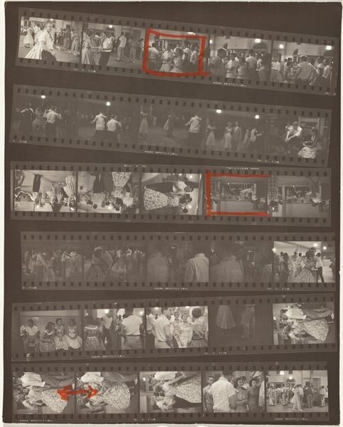 Robert Frank created "Guggenheim 653--Cafeteria, San Francisco" using film. The composition is divided into rows of frames, resembling a film strip. Each frame captures different moments within the cafeteria space. The use of black and white enhances the starkness and contrast. The high contrast, combined with the grainy texture, creates a raw and immediate experience. The repetition of figures, lined up in a cafeteria setting, presents a visual rhythm. The film strip format adds a sense of sequence and narrative, yet the disconnected nature of each frame disrupts a conventional storyline. This work, like much of Frank's oeuvre, challenges traditional photography by emphasizing subjective vision and the deconstruction of linear narratives. Consider how the materiality of the film strip itself—its physical divisions and inherent limitations—mirrors the fragmented experience of modern life. The frame becomes a metaphor for both confinement and observation. This photograph operates as a cultural critique, inviting us to question the structures that define our perception and understanding.