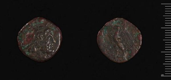 Editor: This is a coin of Agathokles, Tyrant of Syracuse. It's undated, but clearly ancient, and made of some kind of metal. It looks so weathered, like a tangible piece of history. What do you make of it? Curator: For me, it’s a pocket-sized portal! I imagine the hands that clutched it, the market stalls it bought passage through. The slightly rough surface hints at a life well-circulated. It’s a tangible link to a world both familiar and impossibly distant, don’t you think? Editor: That's lovely, I hadn't thought of it that way. Thanks for sharing! Curator: My pleasure! Perhaps we should all carry a coin to remind us of the past.