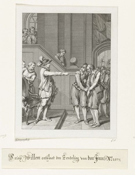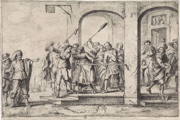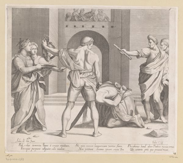 This print, "Geseling van een martelaar," was made by Jan Wandelaar sometime in the first half of the 18th century. It is an etching, meaning that the image was incised into a metal plate, inked, and then printed onto paper. If you look closely, you can see how the artist has used many fine lines to create the image, a time-consuming and highly skilled process. This would have been a costly item in its day, meant for collectors who appreciated both the image and the technique. Wandelaar was known for his anatomical studies, and you can see this interest reflected in the figure of the martyr, who is rendered with great attention to musculature. The print is not just a devotional image, but also a demonstration of the artist's skill and knowledge. Ultimately, it demonstrates how printmaking could elevate craft to the level of fine art, making works of great beauty and complexity accessible to a wider audience.