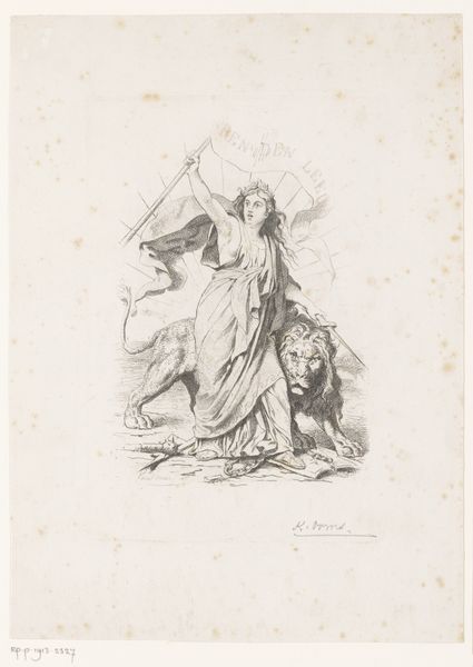 Curator: Let's turn our attention to "Allegorie op de goede regering," an 1881 ink and pencil work by Henri Toussaint. My first impression is that it's quite delicate; the rendering reminds me of an older engraving, though much softer. The overall effect is strangely comforting despite the dramatic subject matter. Editor: It looks like a study on power and its social ramifications, especially when considering who had the luxury of creating such works and the conditions of artistic production. Toussaint made this during a period of intense social stratification in France. How did his position affect his rendering of this allegory? Curator: I'm intrigued by your socio-economic angle! Formally, the light pencil and ink create a sense of movement—notice how the figures flow into each other, particularly the central female figure and the vanquished male figure beneath her. There's a definite hierarchy implied through composition, but what is she holding? Editor: Well, allegorical representations of women holding certain objects would reinforce patriarchal notions around governance, concord, and power in society and politics. A symbol becomes a material tool of production, to reinforce social power relations. Curator: I do not disagree with that viewpoint. Looking closer, it resembles a broken chain. This simple element enriches the semiotic density of the whole work by introducing social disruption, offering resistance perhaps... which counters your theory on pure reinforcement. The artist might subtly criticize those power dynamics through this small, but crucial visual element. Editor: It does present something more ambivalent than sheer reinforcement, it shows the limits of allegorical symbolism in portraying a complex web of power. The artistic experimentation with ink hints at evolving production practices. Curator: Exactly, this ambiguity might be a purposeful aspect of the work's structural composition. Editor: Reflecting on both material constraints and evolving cultural perceptions gives this piece new vitality and helps understand historical making and creative interpretations. Curator: A perfect blend of formalism and historical thinking indeed!