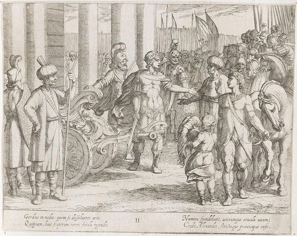 Editor: This etching, "The Infantes Offer to Accompany Ruy Velazquez in His Campaign against the Moors" by Antonio Tempesta, depicts a historical moment. It feels very staged, almost like a theatrical performance. What story do you see unfolding here? Curator: It's a narrative deeply embedded in the historical power dynamics of its time. Consider the context: Tempesta, working in the late 16th and early 17th centuries, is illustrating a Christian campaign against the Moors. How does the act of depicting this specific historical moment contribute to a broader narrative of religious and cultural dominance? Editor: So, it's not just a historical record but also a statement? Curator: Precisely. The figures, the composition – they all contribute to a specific interpretation of this historical encounter, reinforcing certain ideological positions regarding the conflict between Christians and Moors. I wonder how a contemporary artist might engage with this narrative differently. Editor: That gives me a lot to think about. Thanks! Curator: My pleasure.