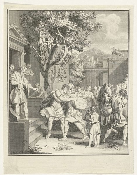 This engraving, "Kroning van een herderspaar" by Simon Fokke, likely from the mid-18th century, uses precise lines to create a scene brimming with classical motifs. The eye is immediately drawn to the right, where figures arrange around a stone pedestal, partially draped with a heavy cloth held aloft by cherubic figures. Notice how Fokke uses the density of lines to define form and texture, creating contrast and depth. The composition is neatly divided into distinct zones: the foreground with kneeling figures, the midground with standing spectators, and a background of stylized architecture and foliage. This tiered construction, combined with the linear precision, suggests a carefully constructed allegorical narrative, perhaps referencing pastoral ideals and societal hierarchy. The engraving employs a semiotic system that speaks to the artistic and philosophical concerns of its time. The idealized figures, classical architecture, and carefully orchestrated scene invite us to decode its meaning and reflect on its cultural values. While seemingly fixed in its representation, this artwork remains open to ongoing interpretation, challenging us to reconsider its place within art history and our contemporary understanding of art.