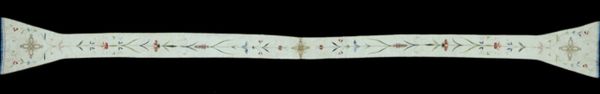 Curator: I’m immediately drawn to the intricate, almost dizzying, patterns of this textile. Editor: This is "Towel Scarf," made sometime in the 19th century by an anonymous artist. It resides here at the Minneapolis Institute of Art. The use of mixed-media on fabric creates such a fascinating textured surface. Curator: Absolutely, the textile speaks to a domestic craft tradition elevated through skillful execution. One sees echoes of the Pattern and Decoration movement even though that’s obviously later. Do you agree? It projects comfort and sophistication simultaneously. It's not merely functional; its artistry suggests a significant place in social rituals or displays. Editor: Definitely. The intense detail points to considerable labor. Looking closely, one wonders about the individual(s) who conceived and executed this, their material conditions, access to dyes and embellishments, and skill passed down through generations. I want to feel its heft. Curator: Good point, and that prompts me to consider who the primary consumer was—its function within a domestic or public sphere, and if its function dictated its design, which blends both abstract and decorative geometric patterns, as you said earlier. The visual language here offers insights into class and taste during the era it was crafted. Editor: Yes, precisely. I think understanding how something like this was produced and circulated reveals a network of dependencies—raw material extraction, trade routes, artisan expertise. What appears merely decorative also functioned within very real social and economic structures. Its materiality is evidence. Curator: That’s a good reminder, seeing art as inextricably linked to social and political realities, that material choices convey coded messages about status and aspirations and identity. Editor: And this reminds me that even mundane objects often carry unseen histories of labor, resource extraction, and artistic expression. Curator: Indeed, there’s much more to explore beneath the surface.