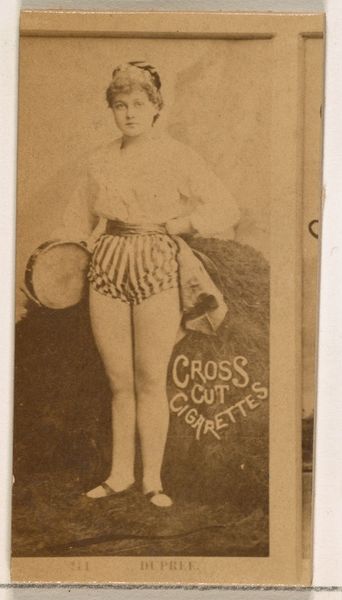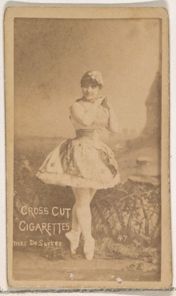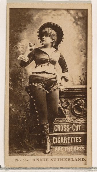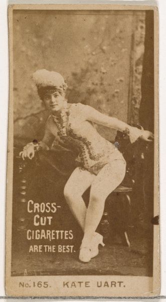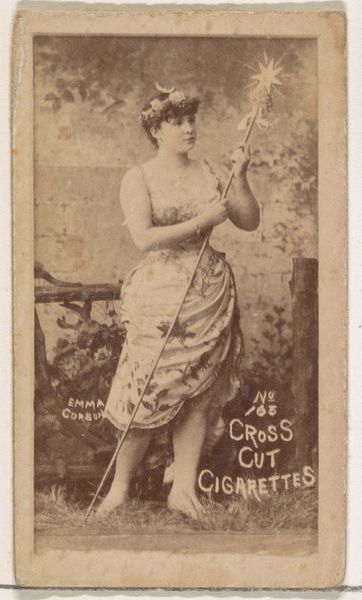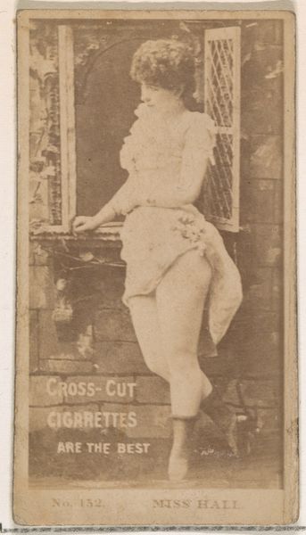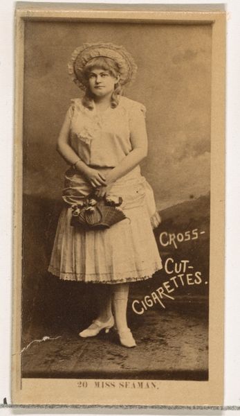This is an advertisement card from the Actors and Actresses series, created by W. Duke, Sons & Co. to promote Cross Cut Cigarettes around the turn of the 20th century. During this period, mass production and advertising were on the rise, and these cards were immensely popular, functioning as both collectibles and promotional tools. The card features a photograph of a young actress seated on a rock, dressed in what might be considered a stage costume. This era often sexualized women, especially actresses, using their images to sell products. The posture of the actress, along with the corset-like bodice, accentuates a feminine image that aligns with the brand’s marketing strategy. However, by placing the actress on a rock in a natural setting, a narrative is being told that is perhaps alternative to the traditional representations of women at the time. Ultimately, this card captures the complex intersections of art, commerce, and gender roles in American society during this time, while highlighting the emotional appeal of celebrity endorsements.