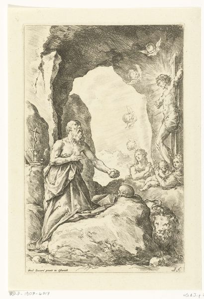 Rembrandt van Rijn created this etching of ‘Saint Jerome Praying: Arched’ in the 17th century, a period marked by religious and social upheaval. Rembrandt, positioned as a keen observer of human emotion, captures Jerome, a scholar, kneeling in what appears to be humble prayer. The etching is rendered with delicate lines and a chiaroscuro effect, characteristic of Rembrandt's style. The setting is dark and somewhat obscured, perhaps suggestive of a conflicted inner life. This interpretation diverges from traditional representations of religious figures as stoic exemplars. Saint Jerome lived in a complex time when religious identity and the individual’s relationship to faith were being renegotiated. Rembrandt seems less interested in Jerome's status and more concerned with his internal state, rendering the saint with human frailty and spiritual yearning. The intimate scale of the etching invites us to consider the personal dimensions of faith, urging us to contemplate the intersections of spirituality, identity, and the search for meaning in a tumultuous world.