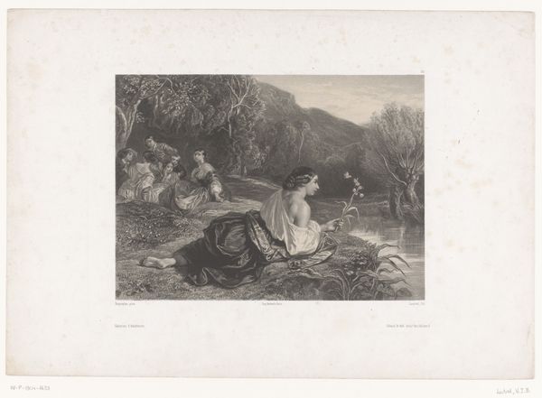 Curator: The prevailing mood is certainly one of tranquility; a dreamlike image filled with gentle light. Editor: Exactly! We're looking at an engraving created by Eugène Gaujean sometime between 1860 and 1900, held here at the Rijksmuseum. The piece is titled "Geluk en Liefde roeien de boot van een jong gezin" which translates to "Happiness and Love rowing the boat of a young family". The visual language is deeply rooted in Romanticism. Curator: Romanticism indeed. A strong compositional focus is certainly placed on the family at rest, nestled together, sheltered in what looks like a river barge. And do you see the winged figure guiding them along? Editor: Without question! And to me that Cupid figure isn’t simply a cherubic form, but a key to unlocking this symbolic journey. In the 19th century, domestic ideals were highly valued and visually reinforced. Curator: Yes, consider also how happiness and love are embodied by these strong figures, guiding the family's vessel with purpose, against an idyllic landscape as a backdrop. It evokes a profound sense of cultural memory, harking back to allegorical traditions found in earlier painting. Editor: I agree. But isn't there also something quietly subversive happening here? The active role of women in guiding the family towards happiness, rowing in unison towards an uncertain future, challenges societal expectations. In other words, where's the male figure directing the journey? It's fascinating, isn't it? Curator: Absolutely. We see symbols not merely as static representations, but as potent actors shaping beliefs and perceptions. The history of the print gives added depth too: consider how prints were instrumental in spreading Romantic ideals throughout Europe. Editor: I agree. This seemingly simple engraving speaks volumes about the socio-political ideals prevalent at the time, whilst prompting a reconsideration of art’s power in either maintaining or shifting conventional standards. Curator: Looking closely has opened fresh ways to understand both our historical past and the symbolic forms that have made up our conscious understanding of life. Editor: Indeed. This image certainly presents a space where art, culture, and history meet to make us think again about how images gain a public and private life over generations.