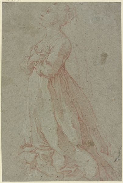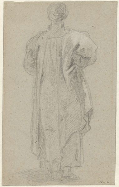 Curator: Let’s turn our attention to this captivating drawing, "Standing Draped Man with a Staff." Though the artist remains unknown, it's believed this piece was crafted sometime in the 16th or 17th century. You can currently find it at the Minneapolis Institute of Art. Editor: Wow, he looks like he’s seen a thing or two, hasn’t he? There’s a weariness in the eyes and a gravity in the pose…almost biblical. He makes me want to offer him a cup of tea and a really good biscuit. Curator: That's an astute observation. This image embodies a figuration of age and perhaps wisdom or endurance. We have to remember the historical context: portraits like this often served not just as likenesses, but also as symbols of social status, power, and, in some cases, piety. The drape suggests something, wouldn't you say? It feels performative. Editor: Absolutely, a very theatrical drape! Like he’s waiting in the wings. I wonder about that staff, though. Is it for support, or is it more like a scepter? He is carrying himself like royalty after all, regardless of the humble material it is drawn in. Curator: Indeed. Consider that in this period, the display of learning or religious devotion was often signaled through symbolic objects such as books, robes, or staffs. The identity of the staff could denote his affiliation with a religious order or scholarly vocation, thus speaking volumes about his placement in society. Editor: It's amazing how much a simple pencil drawing can convey. There’s a real economy of line, too – the artist has captured so much with so little. You know, it sort of reminds me of Giacometti’s sculptures – all essence and barely-there materiality. Curator: Interesting you draw that comparison, focusing as you do on how medium constraints can offer certain freedoms. This piece indeed participates in that story; looking at its themes through such a perspective reveals an almost archetypal quality to it, rendering questions around identity, social standing, and even masculinity. Editor: I came for the aesthetic and accidentally found myself contemplating life's big questions, one pencil line at a time. The beauty of art, isn’t it? Curator: Precisely. Hopefully this glimpse into "Standing Draped Man with a Staff" allows you to think about these broader contexts the next time you stand before art.