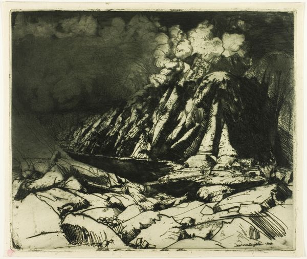 Editor: Here we have "Surtshellir på Island", an engraving by Emanuel Larsen from 1849. It's striking how stark and dramatic the landscape feels, almost otherworldly. What strikes you most when you look at it? Curator: Well, beyond the initial allure of its dramatic light, I find myself pondering what lies beneath the surface, quite literally. This is Romanticism embracing the raw, untamed essence of nature. Notice how the artist uses light not just to illuminate, but to almost *probe* the darkness. Don’t you feel like you’re peering into something ancient? Editor: I do! It feels like looking into a geological past. So, you are thinking about light as symbolic here? Curator: Precisely! Think about what caves represent: the unknown, the subconscious, even death and rebirth. The light becomes a beacon, perhaps symbolizing hope, or knowledge, pushing against that deep unknown. Does the roughness of the engraving itself add to that primal feeling, for you? Editor: Definitely. It’s almost scratchy, emphasizing the ruggedness of the Icelandic landscape, and maybe how harsh life was. It seems this style would perfectly represent a sublime subject in a way that other approaches might obscure? Curator: Absolutely. Larsen’s choice to highlight this volcanic cave becomes a dialogue between the viewer and the formidable power of nature. We confront the monumental. Editor: I hadn't really considered all the layers beneath the surface of the image itself. Now, looking at it, I'm struck by how much it conveys with such stark simplicity. Curator: Isn’t that the joy of discovering art? Sometimes, it’s not just about what’s visible, but about feeling the rumblings beneath.