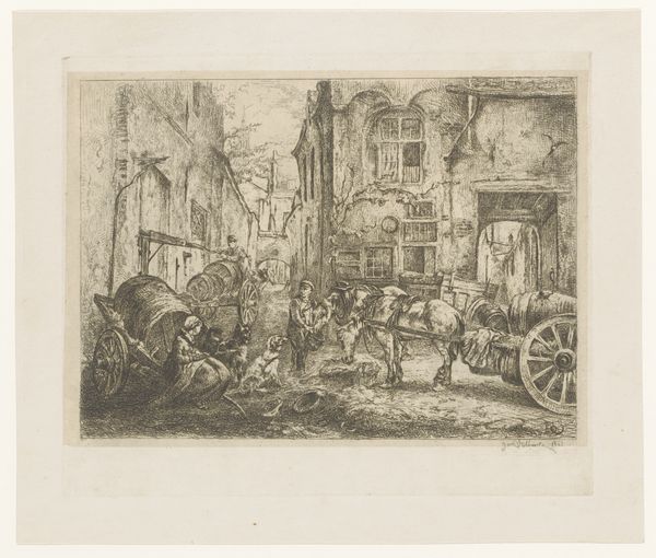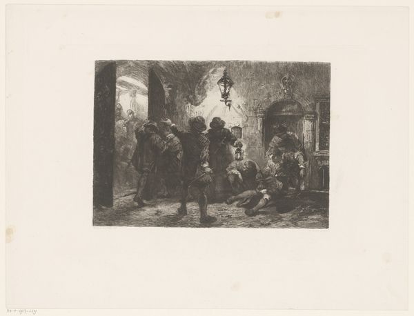 William Unger created this monochromatic etching, "Kwakzalver," with delicate precision. The composition immediately draws the eye to a raised platform. A charlatan gesticulates wildly, his dark form contrasting with the lighter garments of what seems to be his shill on the left, together forming a focal point against the backdrop of a quaint town. Unger uses stark light and shadow to structure the narrative. The figures below appear in various attitudes of engagement and skepticism. Unger's etching functions semiotically, encoding cultural attitudes towards spectacle, trust, and authority. The detailed rendering of architecture and dress, alongside the dynamic arrangement of figures, reveals a society scrutinizing its own behaviors. Note how Unger uses line and contrast to question established meanings, presenting viewers not with a clear moral judgment, but with a complex scene of human interaction. This scene prompts a dialogue about belief and manipulation that goes beyond its period.