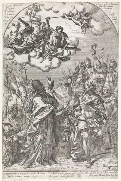Simon Fokke made this print of an attacked gnome in the 18th century using etching and engraving. These processes involve applying varnish to a copper plate, then drawing through it to expose the metal. Acid is then applied, biting into the exposed lines. Look closely, and you’ll see how Fokke used varying depths of line to create a sense of light and shadow. This skilled labor was essential for producing the detailed imagery demanded by the print market. Through the etching and engraving, Fokke has imbued the scene with dramatic tension. The gnome's distress is palpable, heightened by the contrast between the smooth areas of the figures and the densely worked background. The image would have been reproduced many times over. By understanding the labor and skill involved, we can move beyond a simple appreciation of the image and consider its broader social and economic context.