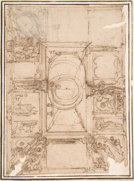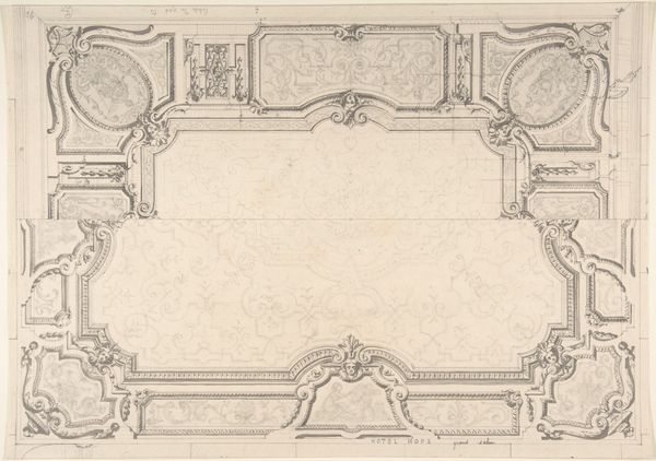 This design for a cartouche or wall panel, made with pen and brown ink, presents a fascinating glimpse into the world of decorative arts and their role in shaping social spaces. This drawing likely originates from 18th-century Europe, a period where architectural ornamentation served as a crucial marker of status and taste. The swirling scrollwork, theatrical masks, and idealized female figures reflect a culture deeply invested in classical motifs and allegorical representation. Such designs were not merely aesthetic choices; they embodied social values and hierarchies, communicating messages of power, refinement, and cultural literacy to those who inhabited these spaces. To fully understand this artwork, one must delve into the pattern books, architectural treatises, and social histories of the period. By studying these resources, we can better appreciate the complex interplay between artistic expression and the social structures that shaped its creation and reception.