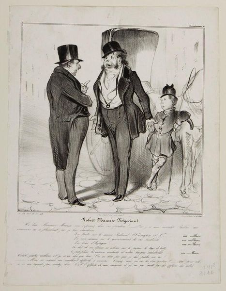 Editor: This is Honoré Daumier's "Seven O'Clock". The figures seem caught between aspiration and weary resignation. What do you read into their expressions? Curator: Ah, Daumier! He saw the world with such wry humor. These men, so elegantly dressed, yet somehow… deflated. They’re caricatures, yes, but also mirrors, reflecting the absurdity of societal expectations. What do you suppose they dream of? Editor: Perhaps, freedom from those very expectations. Thanks, that’s a perspective I hadn't considered! Curator: Anytime! Daumier always seems to have a story to tell.