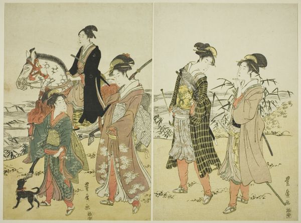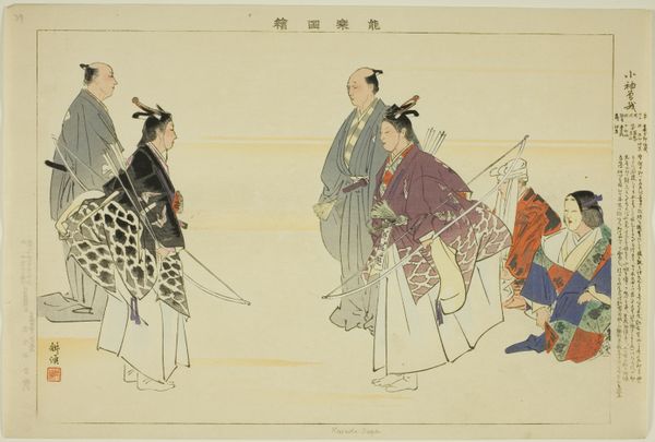 Curator: This is "Kou, from the series 'Pictures of No Performances (Nogaku Zue)'," a woodblock print created in 1898 by Tsukioka Kōgyo. Editor: The composition immediately strikes me as theatrical. The costuming, the postures—there's a drama here that pulls you in. Curator: Exactly! Kōgyo was documenting Noh theatre, which had a resurgence in popularity during the Meiji period. His prints are invaluable records of this art form’s evolving cultural significance. Editor: The figure in the elaborate wig and patterned robe--it feels loaded with symbolic meaning. What can you tell me about the iconography? Curator: Noh theatre, born from ritualistic dances, held enormous social weight in Japan. Actors often wore masks representing specific archetypes. In “Kou,” we're likely witnessing a scene from a play steeped in Shinto or Buddhist philosophy. Editor: Fascinating. I’m drawn to the contrast between the masked figure, the sword that has botanical adornments and the understated observers. How did the Meiji Restoration influence this representation? Was this renewed interest a way to preserve a certain national identity? Curator: Absolutely. Following the Meiji Restoration, there was a conscious effort to redefine Japanese identity amidst rapid Westernization. Reviving and promoting Noh was, in many ways, an act of cultural preservation and nationalistic pride. Think of the gender and class dynamics involved. How was art both reflecting and shaping social strata at the time? Editor: Looking closely, one begins to realize it is not just a representation but also a historical document laden with nuances concerning power, ritual, and identity, carefully composed. Curator: Indeed. And it's through that intersection of history and visual storytelling that we can gain deeper insight into the artwork's lasting relevance and Kōgyo's intention. Editor: Well, my initial impression has definitely deepened. Now I appreciate the piece's many layered facets. It feels so much more intricate than I had originally perceived.