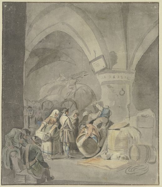 Gottlieb Welté made this watercolor and opaque paint drawing, depicting soldiers and female merchants in a vault filled with barrels and boxes. Welté worked during a period where such images were crucial in creating a sense of shared identity among a growing middle class. Watercolor was a particularly suitable medium for this purpose; it allowed for the relatively quick production of detailed, atmospheric scenes. Note how Welté's technique captures the earthy textures of the barrels, boxes, and stone vaults, all essential for supplying the military. The choice of watercolor here isn't just about aesthetics; it's about making accessible a narrative deeply rooted in the economic activities that supported military campaigns. By focusing on the everyday aspects of military life, Welté’s choice of watercolor elevates the material realities of labour and trade. It blurs the lines between fine art and craft, inviting us to consider the social and economic contexts that shape our understanding of art.