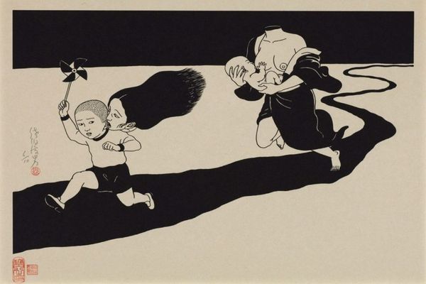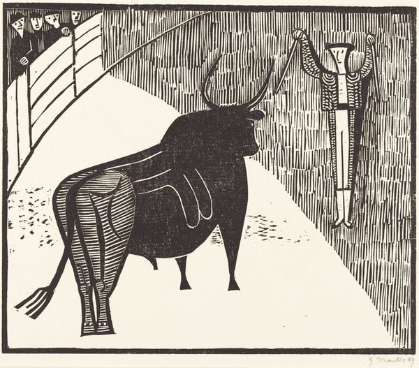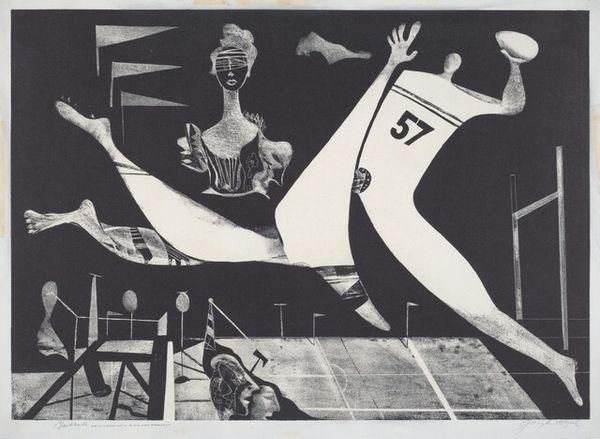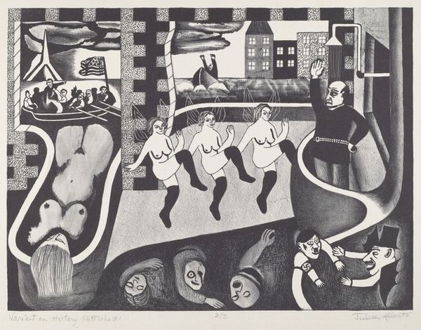 Curator: Leo Meissner, an artist predominantly recognized for his printmaking, created "It’s a Small World" in 1930. Made using drawing and print medium, it offers a compelling snapshot of urban life. Editor: Okay, immediately, this feels like a study in perspective. Not just visual, but psychological. We're ground level, almost ant-like, amidst this flurry of feet and… is that a Scottie dog? I love it! It's like the world is rushing past. Curator: It’s fascinating how Meissner chose to focus on this perspective. Think about the social context of the 1930s – urbanization was booming. Images shifted away from open landscapes and the like toward documenting modern living and cityscapes. Editor: Absolutely. There’s this overwhelming feeling of anonymity and congestion. Each individual is just a pair of legs moving along; the building structures become geometric patterns instead of places with individual addresses. Curator: Right, and the elevated point of view reinforces the power structures, but instead, he chooses the grounded perspective. I think the style captures an unvarnished realism, documenting that sense of progress. Editor: What do you mean 'grounded perspective?' Literally grounded - the POV almost has the viewer face-to-face with a stray dog. Gives you this unexpected empathy... Makes you wonder about all those little unseen stories buzzing beneath the surface, the world the power structures don't notice. Curator: Meissner highlights ordinary moments in an era of vast transformation. His prints showcased how art can capture the essence of societal shifts. Editor: And for me, this print is more than that. With its unusual framing, slightly anxious atmosphere... It hints at modern alienation in what otherwise may seem like an image capturing an orderly environment. Curator: In sum, “It's a Small World," serves as a great example of a realist take during rapid change of city landscapes, when American art started incorporating new perspectives, and portraying everyday life experiences. Editor: So much so that while Meissner titled it, "It's a Small World," it's still amazing how large the little stories beneath our feet actually are.