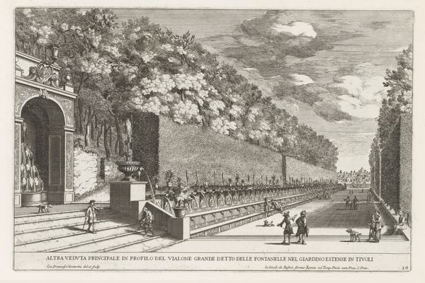 Giovanni Francesco Venturini made this print of a fountain in the gardens of the Villa Doria Pamphilj in Rome, around the turn of the 18th century. It depicts a carefully designed arrangement of nature and artifice: a constructed grotto, fountain, and statuary are interwoven with trees, pathways, and decorative hedges. The Villa Doria Pamphilj itself exemplifies the intertwined relationship between elite families, the Catholic Church, and artistic patronage. Originally a private estate, it was expanded in the 17th century by the Pamphilj family, who had close ties to the papacy. Such villas served as both retreats and displays of wealth and power. The architecture and gardens were designed to impress visitors and reflect the family's elevated social status. Understanding this artwork requires research into the history of the Pamphilj family, the design principles of Baroque gardens, and the social function of villas in 17th and 18th century Rome.