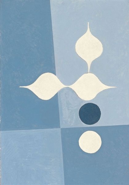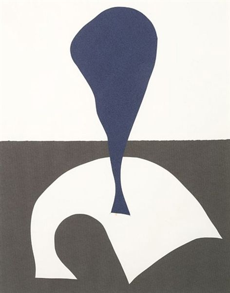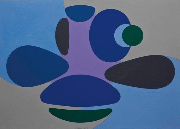 Victor Vasarely created "Cailloux-V" with a palette that whispers rather than shouts. It is a composition of organic forms in muted blues, grays, whites, and blacks, all nestled within a light beige field. These pebble-like shapes, defined by soft edges, float and overlap, creating a visual depth that's both subtle and engaging. Vasarely's work here flirts with the principles of Gestalt psychology, particularly the idea that the whole is greater than the sum of its parts. Each individual shape is simple, yet together they create a dynamic interplay of figure and ground. There is an ambiguous relationship that challenges the viewer's perception and understanding of spatial relationships and the interplay between positive and negative space. The artwork invites a contemplation on how our minds organize and find patterns. "Cailloux-V" offers no fixed focal point, suggesting a universe in constant flux. This challenges traditional artistic structures and invites each viewer to construct their own narrative.