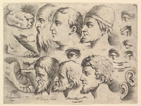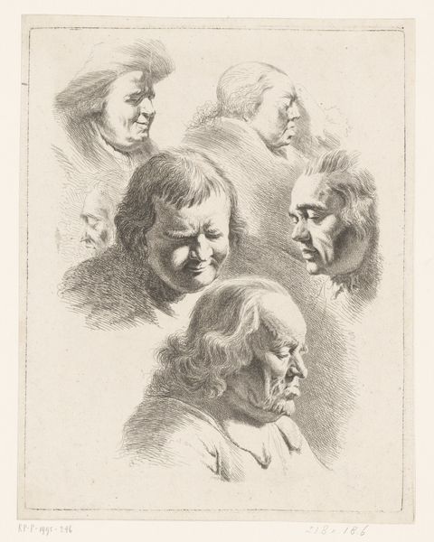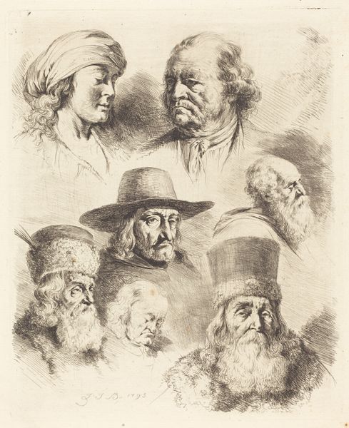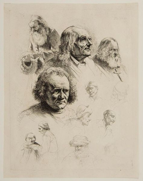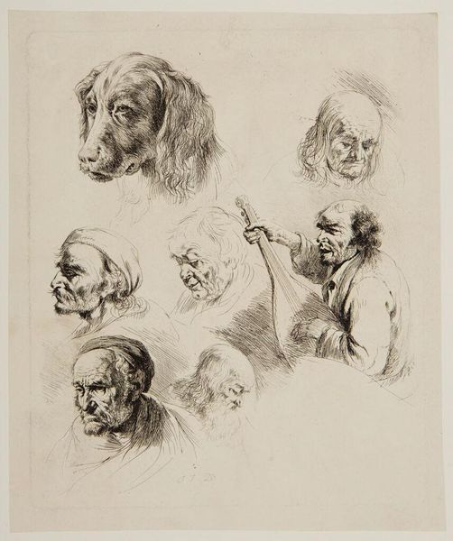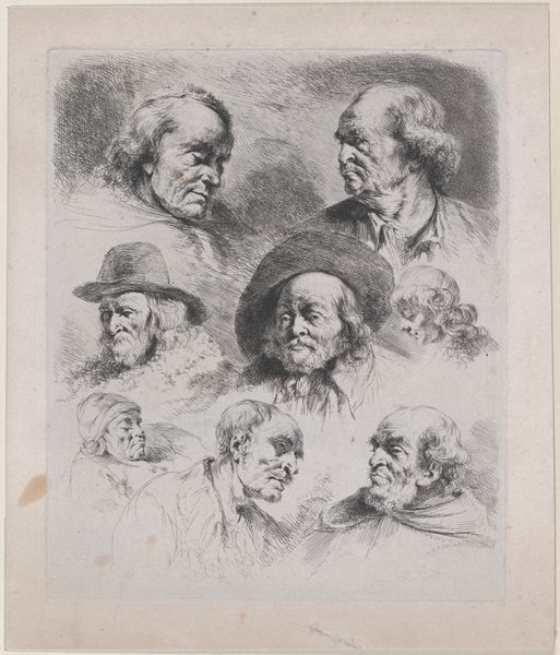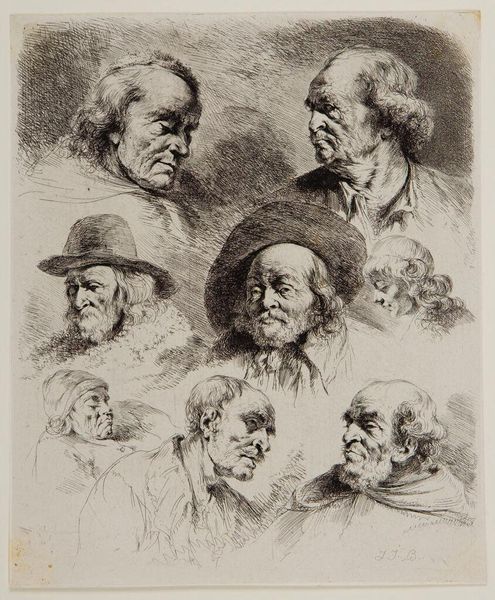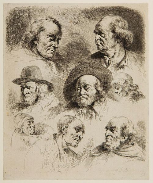 In 1770, Jean Jacques de Boissieu created "Study of Thirteen Heads," an etching now housed at the Metropolitan Museum of Art. Boissieu lived during the Enlightenment, a period where reason and observation were highly valued. This work reflects that interest, serving almost as a catalog of human character through its detailed studies of different faces. However, it's important to consider who gets represented and how. The prominence given to older, bearded men suggests a reverence for age and perhaps authority, while the fleeting glimpses of women in servant-like roles provide a stark contrast. The artist's own social standing as a bourgeois man undoubtedly shaped his perspective. Boissieu isn't just showing us faces; he's offering a glimpse into the social hierarchies of his time. It makes me think about how we assign value and visibility even today, and who gets to be seen and remembered.