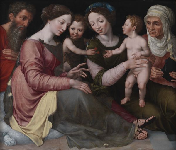 Curator: Here we have Albrecht Dürer's "Dresden Altarpiece," created around 1496. It's a stunning example of Early Renaissance art now residing in the Gemäldegalerie Alte Meister in Dresden. Editor: It strikes me immediately with its compartmentalized nature. Three distinct panels, each teeming with figures, yet feeling oddly isolated from one another through color and depth. Curator: Precisely. Each panel tells its own part of the larger narrative. The left shows Saint Paul, the center the Virgin and Child, and the right depicts Saint Anthony. Each were incredibly important and powerful figures during the creation of this piece. It highlights their importance within the larger society of the era. Editor: Observe the composition within each panel. Saint Paul, framed by swirling angels, sits rigidly, dominated by deep blues, while Saint Anthony is almost skeletal against his heavenly background of roseate cherubs. There is such a stark contrast. Curator: And let’s consider its role. Altarpieces were more than mere decoration; they were integral to religious practice and were used within the Church to project authority and instill devotion. This altarpiece likely adorned a significant church, serving as a focal point for worship. Editor: I notice the symbolism imbued into everything from a halo hovering in one pane to the color choice. Each color plays with space, depth, and importance to highlight the core figures. The symmetry creates an appealing harmony between them that allows a visual storytelling to occur. Curator: Dürer was masterful at navigating the political and religious sensitivities of his time, and "Dresden Altarpiece" is no exception. It spoke to both the elite and the common person in a way that reinforced societal structures and values. The careful use of perspective and space also adds layers of understanding and draws one's eyes across each segment for understanding. Editor: The texture achieved through tempera and oil is astonishing. Up close, one can appreciate Dürer's skillful manipulation of light and shadow and one will notice he also takes liberties when portraying religious figures such as cherubs or children making their shapes almost human, yet slightly uncanny, for visual tension. Curator: Examining art within its historical and cultural context provides insight into the motivations of both artist and patron. The Altarpiece offered not just religious guidance, but also reaffirmed social standings of the city of Dresden. Editor: It offers more depth to appreciate the way he employed material choices and artistic decisions to bring deeper thematic considerations into the finished work. Curator: Exactly, and combined those observations illuminate the complex narrative woven within Dürer's work, don’t you think? Editor: Yes, it provides clarity.