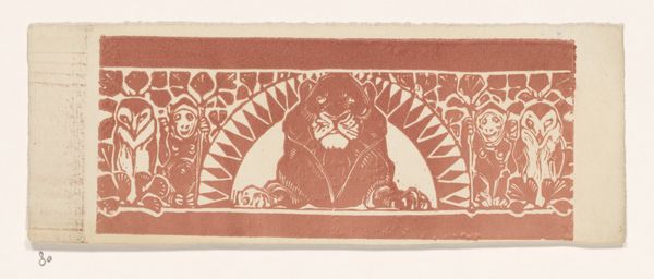 This ornament with a fox by Bernard Willem Wierink was made without a date using woodcut. The limited colour palette of red and white emphasizes the graphic quality, where the design becomes the focus, inviting us to explore the relationship between form and function. The fox is centered, poised above the frame; its presence transforms the surrounding geometric ornament into a narrative. The lines are precise, almost mechanical, yet there's a handmade quality that gives the piece warmth. Notice how the texture of the wood grain subtly appears through the ink, reminding us of the artist’s process. The fox, caught mid-gaze, is so upright, and so present, that it feels like the whole artwork hinges on its being. Wierink’s contemporaries include designers like Walter Crane who were also deeply engaged with nature. Like them, Wierink embraced ambiguity, encouraging viewers to find their own stories within the image.