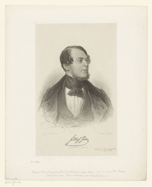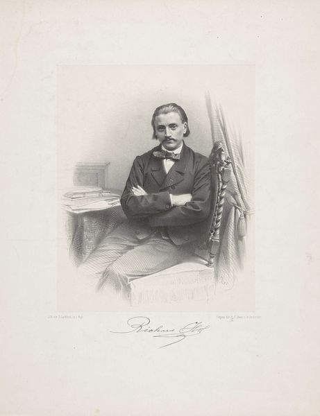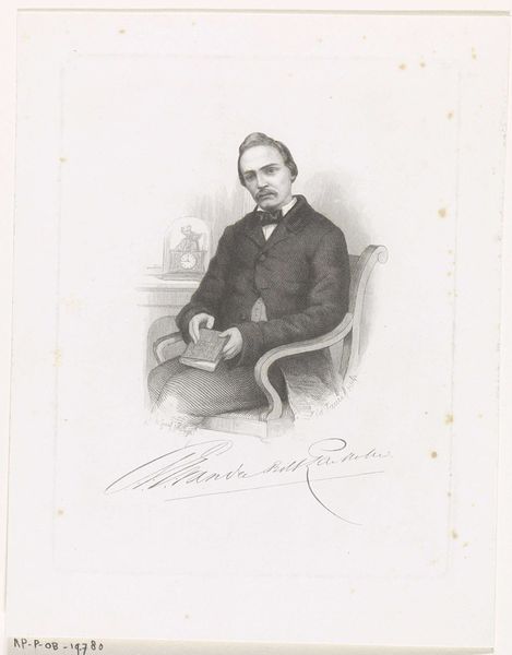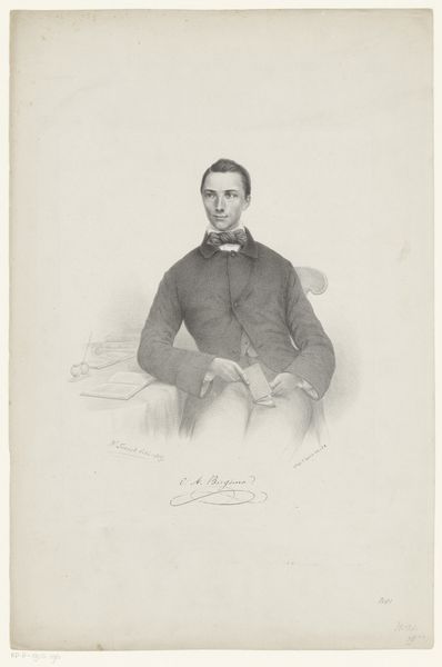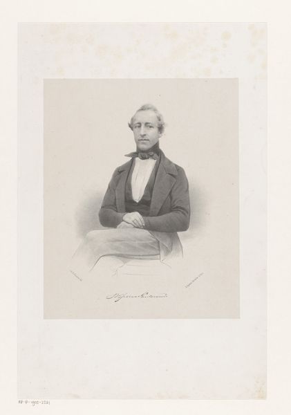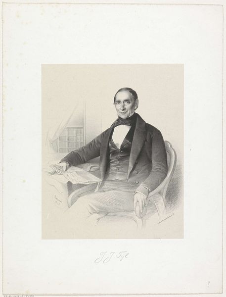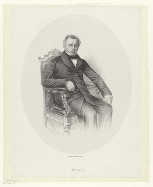 Willem Troost made this portrait of Pieter Hendrik Suringar using lithography. This formal portrait offers a glimpse into the world of 19th-century Dutch academia and its representation of masculinity. Suringar, dressed in a dark jacket and seated in an ornate chair, holds a book, symbolizing his intellectual pursuits. His posture and attire reflect the values of the time, emphasizing the importance of education and social standing. Troost captures Suringar in a manner that both celebrates and conforms to the conventions of bourgeois portraiture. This image, while seemingly straightforward, invites us to consider the subtle ways in which power and identity were constructed and communicated through visual representation during this period. It asks us to contemplate the historical context and the personal narratives intertwined within this formal depiction.