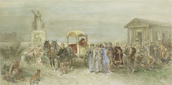 Vasily Perov's watercolor, Evening on Holy Saturday, offers a glimpse into 19th-century Russia, a society marked by stark class divisions and religious fervor. Perov was deeply interested in the lives of the poor and often turned his critical eye toward social inequalities. Here, we see a landscape populated by figures from different strata of society as they make their way to church on the eve of Easter. The painting subtly critiques the Russian Orthodox Church through the contrast between the wealthy, riding in their carriages, and the impoverished masses, trudging along on foot. Perov's realism is not just about depicting a scene but about inviting empathy, encouraging viewers to consider the lives and experiences of those often overlooked. In focusing on the emotional and material conditions of ordinary people, Perov invites us to reflect on the social structures that shape individual destinies. This image, while depicting a specific time and place, resonates with broader questions about inequality, faith, and the human condition.