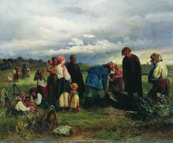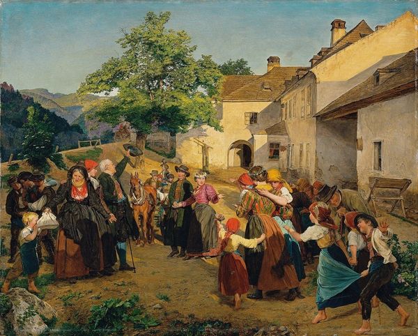 "Homecoming from the Harvest," made by Ferdinand Georg Waldmüller, shows us a procession of people on the path after a day's work. Painted with oils on canvas, the artist employed traditional painting methods to capture the scene. But this is no mere landscape; it's a scene of labor. Look closely and you'll see the rough textures of the woven baskets, the thick, bundled hay, and the simple, durable clothing of the workers. These details speak to the agricultural practices and folk traditions of the time. Consider the sheer physicality of the harvest, and the human effort needed to gather, bind, and transport the crops. Waldmüller doesn’t shy away from representing the reality of rural life, but neither does he dwell on it. Instead, he emphasizes the communal aspect of the labor and the landscape, elevating it to a position of dignity and honor. By focusing on materials, making, and social context, we gain a richer appreciation for the layers of meaning embedded in this artwork, challenging any strict division between high art and craft.