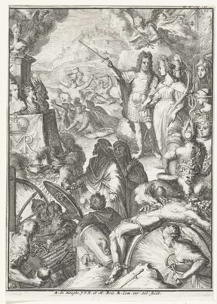 Curator: Well, hello there! Take a look at this compelling print, “Crucifixion of Christ and Allegory with Virtues." It was created sometime between 1681 and 1740, likely designed by François van Bleyswijck. You can find it here in the Rijksmuseum. It's an engraving with very detailed linework, very much in the baroque style. Editor: Woah! That's a lot to take in, right? My first impression is…drama! The theatrical kind, you know? The figures all seem to be caught mid-gesture, almost like a freeze-frame of some really intense stage play. What strikes me is the chaotic harmony it evokes; it seems both messy and meticulously composed. Curator: Baroque art often sought to overwhelm the senses and inspire piety through such displays. It aimed to connect earthly life with the spiritual. The "history painting" element references Christ's sacrifice. Meanwhile, the allegory is a display of virtue defeating vice. It’s propaganda rooted in moral instruction, all composed through classically allegorical symbolism. Editor: I dig that—the 'earthly meets spiritual' vibe. The top scene with the crucifixion framed like a performance, like a holy show—and the bottom half swirling with these mythological creatures and angelic babies feels…trippy, almost. The engraving style does give it a unique timelessness. Tell me, why do you think this blend of religious imagery and allegorical figures was so popular then? Curator: Well, such depictions gave artists the freedom to interpret scripture and tradition in new ways, aligning faith with evolving societal values. By embedding the virtues so literally, and the "sacrifice" into daily experience, its goal was shaping public perception through narrative and visuals. Editor: Cleverly manipulative and visually decadent... but I do admire its craft. Now looking closer, I do appreciate the level of detail someone put into each element of this print—especially on the symbolic elements below the depicted scene. A lot is happening in this engraving, even for one viewing! Curator: And seeing it now, within the walls of the Rijksmuseum, the image takes on new layers of significance, prompting reflection about our modern values. The historical role of propaganda, artistic liberty and our perceptions about that past. Editor: True that! Who knew a little engraving could hold so much weight and historical richness. Thanks for the deep dive, historian. Curator: Likewise, it’s amazing how the raw feelings about "drama and emotion" in this moment echo in contemporary minds and imaginations.