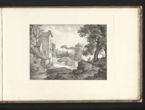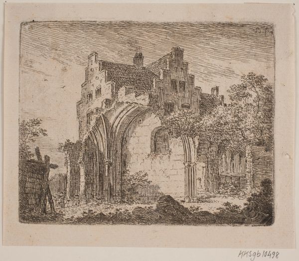 Curator: This print, attributed to Peter Christian Schøler, is entitled "Borgruin ved en flod," or "Castle Ruins by a River." Created sometime between 1803 and 1835, it’s a striking example of early 19th-century Danish Romanticism, held in the collection of the SMK, the National Gallery of Denmark. Editor: Oh, a ruin. Always good for a bit of brooding! It’s the kind of place I'd want to sit, journal in hand, and write terrible poetry about the passage of time. Curator: Indeed. Romanticism often used ruins as symbols of decay, reflecting on the fleeting nature of human achievements. Schøler's print employs a very precise, realistic technique for an engraving. You see how the light plays across the stonework? Editor: Absolutely! It's delicate, like dust motes dancing in a forgotten room. And I like the way the river mirrors the building, creating a doubling effect, almost as if time is bending in on itself. Gives me a delightful sense of melancholy, honestly. Curator: Precisely the intended effect, I would say! But consider the historical context: the print would have circulated in a society grappling with shifting national identities. Images of past grandeur could inspire both nostalgia and a renewed sense of purpose. Editor: Or, perhaps, inspire a wave of ambitious restoration projects. Who wants to live next to an old, crumbly anything? Get those masons in! Seriously, though, seeing the tiny figure in the boat emphasizes how humanity continues. The human spark just keeps finding new vessels. Curator: A compelling thought. The inclusion of people allows the artwork to hint at the theme of history, offering a view of the present, which is inseparably associated with the past. Editor: So, in the end, both artists and historians share a common purpose: looking to the past in order to inform and inspire present discussions. Curator: Nicely put. Schøler’s engraving presents a vision steeped in a particular moment, but still speaks eloquently to anyone who gazes upon it. Editor: Indeed, from castle to page, we witness an interesting transfer.