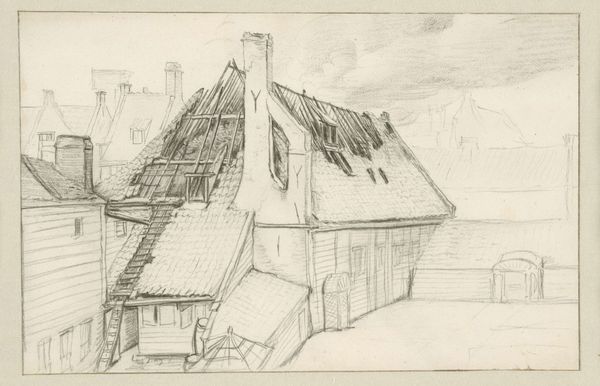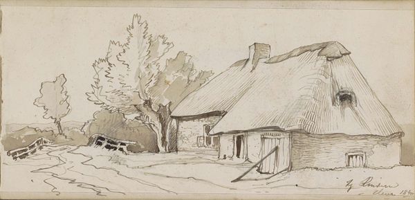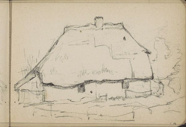 Curator: Looking at this drawing, I'm struck by the overwhelming sense of coziness, if that makes sense. There's a comforting feel to it. Editor: Yes, there is something intimate about this sketch, especially knowing it comes directly from Willem Cornelis Rip's sketchbook. Created around 1896-1897, this piece, "Farmhouse with a Thatched Roof," is executed with pencil and pen-and-ink on paper, and what we see represents far more than just rural architecture. Curator: The texture he achieves with the cross-hatching and varied line weights is really effective. Note how the heavy, dark strokes capture the density of the thatched roof, contrasted with the light touches that suggest the aging paper of the sketchbook itself. Editor: Exactly. But beyond that careful observation, think about what farmhouses, especially those with thatched roofs, represented at this time. These weren't simply buildings; they were symbols of rural life, deeply connected to the identity of agrarian communities, but under intense socio-economic pressure as urbanisation gathered pace. Curator: True, but even divorcing ourselves from that socio-economic element for a moment, the artist’s skill in manipulating line creates such depth and dimension. See the simple fence-like structure in front of the main part of the house—barely rendered, but contributing hugely to the recession of space. Editor: And Rip likely wasn't neutral in depicting it. Artists like Rip often presented these scenes with a romantic lens, idealising the hard labor and class divisions of rural life to offer a vision of authentic, simple living amidst growing industrial society and its emerging inequalities. Curator: Even the choice to work in sketch format rather than a more finished painting can be read as something significant in this regard. There is no high art pretence here; it captures a candid and intimate reflection of something true and accessible, almost journalistic. Editor: An important reminder that visual observation and art technique can tell us many stories and provoke many questions. Curator: Agreed, let’s move on to the next piece and see what else awaits!