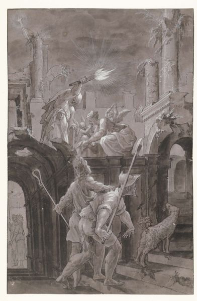 This drawing, whose maker and date remain unknown, presents us with a compelling scene executed in graphite and gray wash on paper. The monochromatic palette emphasizes the textural contrast between the figures and the architectural elements, adding drama to the subject. Notice the laborious layering of wash which gives depth to the dark tones of the cityscape. The artist meticulously built up these shadows to create a somber, almost oppressive atmosphere. This technique, combined with the precision of the graphite lines used to define the figures, reflects a highly skilled hand, trained in academic drawing. However, the fantastical subject matter – an angel scourging a harpy – departs from traditional artistic themes. This juxtaposition of conventional technique with unconventional subject matter challenges the hierarchy between fine art and illustration. It invites us to consider how artists have historically used craft to explore themes of morality, power, and the struggle between good and evil, reflecting the social and political tensions of their time.
