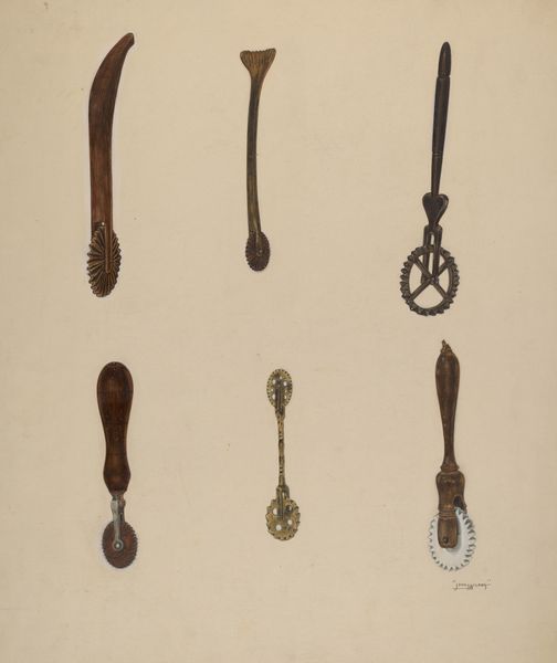 Dimensions: Hammer (a): L. 11 1/2 in. (29.21 cm); head, 3 1/16 x 9/16 in. (7.78 x 1.43 cm); hammer (b): L. 8 11/16 in. (22.1 cm); head, 2 3/8 x 13/32 in. (6 x 1 cm); hammer (c): L. 8 15/16 in. (22.7 cm); head, 2 1/32 x 3/8 in. (5.16 x 0.95 cm); hammer (d): 9 3/4 in. (24.77 cm); head 2 5/32 x 9/16 (5.48 x 1.43 cm); face Diam. 5/8 in. (1.59 cm); hammer (e): L. 8 3/8 (21.27 cm); head, 1 5/8 x 13/32 in. (4.13 x 1.03 cm); hammer (f): L. 8 13/16 in. (22.38 cm); head 2 1/16 x 9/32 in. (5.24 x 0.71 cm); chisel (g): L. 12 in. (30.48 cm); blade, 7 5/16 x 13/16 in. (18.57 x 2.06 cm); punch (h): L. 7 3/8 (18.73 cm); shaft at base, 4 29/32 x 7/32 in. (12.46 x 0.56 cm); planisher (i); L. 7 1/16 (17.94 cm); blade L. 3 in. (7.62 cm); planisher (j): L. 7 25/32 in. (19.76 cm); blade, 3 27/32 x 1/2 in. (9.76 x 1.27 cm); awl (k): L. 5 1/2 in. (13.97 cm); shaft L. 2 7/8 in. (7.3 cm); file (l): L. 8 1/16 in. (20.48 cm); blade, 4 1/2 x 3/8 in. (11.43 x 0.95 cm); file blade (m): L. 5 1/4 in. (13.34 cm); file blade (n): L. 7 9/32 in. (18.49 cm); file blade (o): L. 5 1/2 in. (13.97 cm); file blade (p): L. 5 3/8 in. (13.65 cm); file blade (q): 7 13/16 cm (19.84 cm); band/channel engraver (r): L. 6 3/8 in. (16.19 cm); graver L. 3 27/32 in. (9.76 cm); guide L. 3 1/4 in. (8.26 cm); guide W. 5/16 in. (0.79 cm); graver and screwdriver set (s): L. 5 3/8 in. (13.65 cm); ferrule L. 1 7/8 in. (4.76 cm); nine screwdriver tips, W. 3/32–3/16 in. (0.24–0.48 cm); wood tool handle (t): L. 2 9/16 in. (6.51 cm); wood tool handle (u): L. 3 13/16 in. (9.68 cm); wood mallet (v): L. 12 3/8 in. (31.43 cm); head Diam. 2 1/4 in. (5.72 cm); head H. 2 17/32 in. (6.43 cm); graver (w): L. 3 1/2 in. (8.89 cm); graver (x): L. 6 in. (15.24 cm); graver (y): L. 5 5/8 in. (14.29 cm); graver (z): L. 3 1/32 in. (7.70 cm); gravers (aa–aaa): various sizes; saw blade (bbb): L. 5 7/8 in. (14.92 cm); W. 3/8 in. (0.95 cm); straight edge with button handle (ccc): L. 7 7/8 in. (20.00 cm); W. 11/16 in. (1.75 cm); straight edge (ddd): L. 8 in. (20.32 cm); W. 5/8 in. (1.59 cm); pliers (eee): L. 5 5/8 in. (14.29 cm); semicircular punch (fff): L. 3 3/4 in. (9.53 cm); caliper (ggg): L. 4 3/8 in. (11.11 cm); caliper (hhh): L. 5 5/8 in. (14.29 cm); caliper (iii): L. 7 in. (17.78 cm)