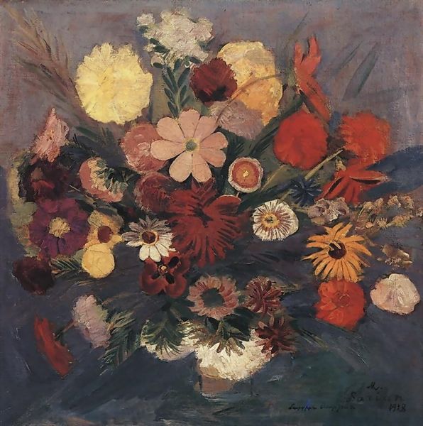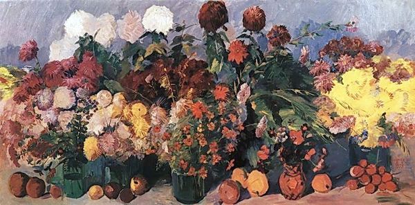 Curator: Oh, wow. What a burst of joy. It’s almost overwhelming, isn’t it? A cacophony of color. Editor: Absolutely! Let me introduce us. This is “Yerevan Flowers,” a still life conjured up in 1957 by the Armenian master Martiros Sarian. You can find this oil on canvas residing at the Tretyakov Gallery in Moscow. Quite the pedigree, wouldn't you say? Curator: Pedigree aside, those oranges scattered on the patterned tablecloth...they anchor the piece. Give it a solidness amidst all that flamboyant floral energy. I keep wanting to pick one up. Editor: The fruit and the tablecloth present domestic bliss, though there's a clear move beyond merely decorative to exploring shape and colour. Flowers, for centuries, have symbolized cycles of life, beauty, and, yes, even transience. Their fleeting existence underscores that intense, concentrated moment captured here by Sarian. Look closer and tell me, do these particular flowers resonate with anything in particular? Curator: The Gladioli, maybe? Standing so tall, like soldiers in saffron and ochre... There’s something resilient in them. You almost wouldn't imagine these painted in a Cold War environment. It’s interesting, too, that even while adhering to some impressionistic gestures, he still goes beyond realism and evokes a profound sense of symbolic orientalism in color choice, forms, composition. Editor: Interesting. Sarian lived a life shaped by dramatic political shifts, witnessing both Tsarist Russia and the rise of the Soviet Union. One can’t help but consider those experiences subtly bleeding into his canvas, informing his choices on conveying hope within fragility. It's like a visual mantra that echoes resilience. And Sarian seems very consistent, exploring that subject with bright colour throughout his entire career. Curator: And yet, the individual blooms feel free, unrestrained. Perhaps that’s Sarian’s sly commentary? Even amidst larger forces, life—like these tenacious flowers—finds a way to celebrate and assert its beauty. So…it makes me appreciate them. More than the others here. Editor: You’ve nudged me towards a richer view. Sarian gifts us not just a painting of flowers, but a vibrant lesson on resilience and enduring hope. A quiet power blooms here.